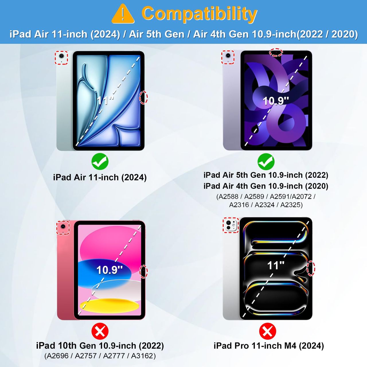 - Projetado Exclusivamente Para Ipad Air 11 Polegadas (m2) 2024 (número Do Modelo: A2902/a2903/a2904), Ipad Air 5ª Geração 2022 (número Do Modelo: A2588/a2589/a2591), Ipad Air 4ª Geração 2020 (número Do Modelo: A2072/a2316/a23316/a23316/a2331). 24/a23 25) Tablet De 10,9 Polegadas. Não É Compatível Com Outros Dispositivos.
