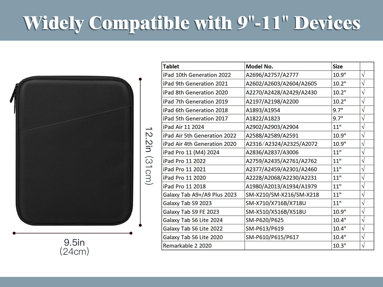 - Compatibilidade: Projetada Para Tablets De 9 A 11 Polegadas, Esta Bolsa Para Tablet É Compatível Com Ipad De 11 Polegadas A16 2025 (11ª Geração), Ipad 10ª Geração (11 Polegadas), Ipad 9ª/8ª/7ª Geração (10,2 Polegadas), Ipad Air 11 (m3 2025/m2 2 2 024), Ipad Air 5ª/4ª Geração (11 Polegadas), Ipad Pro 11 Polegadas, Galaxy Tab A9+/a9 Plus 27.9 Cm, Galaxy Tab S9 27.9 Cm/s9 Fe 27.7 Cm, Galaxy Tab S6 Lite 26.4 Cm, Notável 2 26.2 Cm.