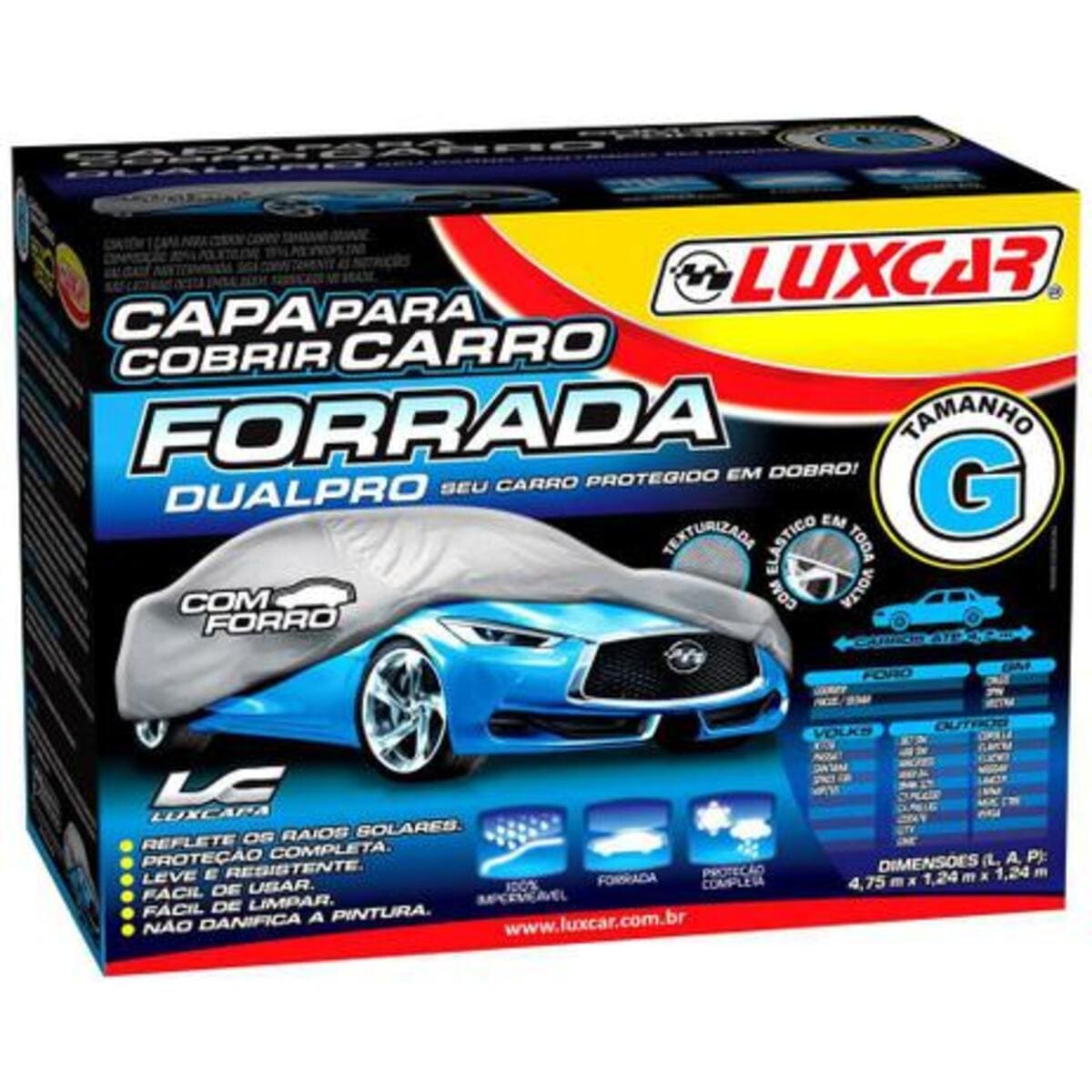 A Capa para Veículo Forrada DualPro Luxcar oferece proteção total contra água, sujeira, poeira, sereno, dejetos de aves, seiva e resíduos de árvores, fuligem, maresia, poluentes, respingos de tinta, arranhões superficiais e raios solares. Esta capa é 100% impermeável e possui forração nos pontos de contato com o carro, ideal para situações em que o carro necessite ficar exposto ao clima. Confeccionada forro em TNT e polietileno de alta qualidade e resistência com camada refletiva para proteger mais contra os raios solares.