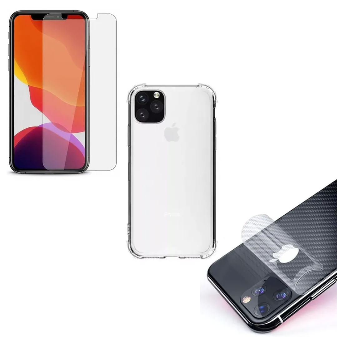Capinha antichoque anti impacto transparente e Película protetora de vidro e Película traseira fibra de carbono Compatível com: Iphone 11 Pro Max Tela 6.5 Características: Capinha antichoque: - Material: silicone - Bordas reforçadas - Proteção contra quedas e choques no aparelho - Cor: transparente Película protetora de vidro temperado transparente: - Protege a tela LCD contra fortes impactos - Película de vidro temperado anti estilhaço - Encaixe perfeito na tela do seu aparelho - Resistente à riscos e marcas de dedos - Material Ultra Clean permitindo assim a máxima transparência - Discreta e funcional sem alterar a sensibilidade do touch screen - Fácil aplicação e aderência perfeita. - Remoção simples e limpa sem deixar resíduos Película traseira fibra de carbono: - O material e liga da película de alta qualidade - Fácil aplicação - Remoção fácil sem deixar resíduos - Transparente com textura da fibra de carbono - Discreta e funcional - Feito em material extremamente flexível e fino. - Ideal para proteger a traseira do Smartfone contra arranhões e sujeira. Conteúdo na embalagem: 01 UN Capinha de silicone antichoque transparente 01 UN Película protetora de vidro temperado 01 UN Película traseira fibra de carbono Garantia: 90 dias Imagens ilustrativas, não acompanha o Smartphone.