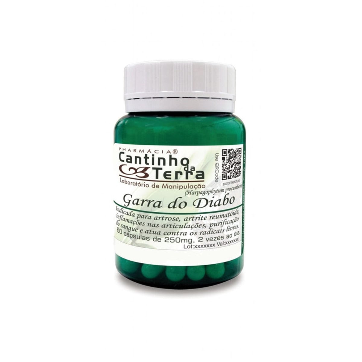 Embalagem com 60 cápsulas de 250mg de Garra do Diabo e Excipientes...INDICAÇÃO.Suas raízes são usadas para fazer um medicamento, usado para aterosclerose, artrite, gota, dor muscular, dor nas costas, tendinites, dores no peito, irritação gastrointestinal ou queimação, febre e enxaqueca. .Também é usada para dificuldades no parto, problemas menstruais, reações alérgicas, perda de apetite e doenças renais e da bexiga. Pode ser aplicada na pele para tratar ferimentos e problemas cutâneos..Hoje em dia, a garra do diabo é usada contra inflamações e para aliviar a dor da artrite, dores de cabeça e dores nas costas. Testes indicam que a garra do diabo pode ajudar a combater inflamações...COMPOSIÇÃO: 250mg de Garra do Diabo e Excipientes...CONTRA INDICAÇÃO.Pessoas com úlceras estomacais, úlceras no duodeno ou pedra na vesícula não devem tomar a garra do diabo. O mesmo vale para mulheres grávidas ou amamentando, já que estudos não foram feitos para comprovar a segurança. Pessoas com doenças cardíacas ou hipertensão devem perguntar a seus médicos antes de começar a tomar a garra do diabo..Medicamentos que são metabolizados pelo fígado podem ter uma absorção mais lenta durante o uso da garra do diabo, e tomar o extrato com alguns desses medicamentos pode aumentar seus efeitos colaterais no corpo..A garra do diabo pode causar a queda dos níveis de açúcar no sangue, e no caso de uso de medicamentos que diminuem os níveis de açúcar do sangue, pode haver uma queda muito grande, portanto, é necessário um acompanhamento médico e uma monitorização dos níveis de açúcar no sangue durante o tratamento com a garra do diabo...ORIENTAÇÕES GERAIS .¿ Nunca compre medicamento sem orientação de um profissional habilitado..¿ Imagens meramente ilustrativas..¿ Pessoas com hipersensibilidade à substância não devem ingerir o produto..¿ Em caso de hipersensibilidade ao produto, recomenda-se descontinuar o uso e consultar o prescritor ..¿ Não use o medicamento com o prazo de validade vencido..¿ Manter em temperatura ambiente (15 a 30ºC). Proteger da luz, do calor e da umidade. Nestas condições, o medicamento se manterá próprio para o consumo, respeitando o prazo de validade indicado na embalagem..¿ Todo medicamento deve ser mantido fora do alcance das crianças..¿ Este medicamento não deve ser utilizado por mulheres grávidas ou no período de amamentação sem orientação médica..¿ Embora não existam contraindicações relativas a faixas etárias, recomendamos a utilização do produto para pacientes de idade adulta..¿ Siga corretamente o modo de usar. Não desaparecendo os sintomas, procure orientação médica..¿ Este medicamento não deverá ser partido ou mastigado..¿ ¿Se persistirem os sintomas, o médico ou farmacêutico deverá ser consultado¿...*Produto autorizado para comercialização em todo o território nacional através do anexo I da RDC 27/2010, em conformidade com a RDC 23/2000 da ANVISA.