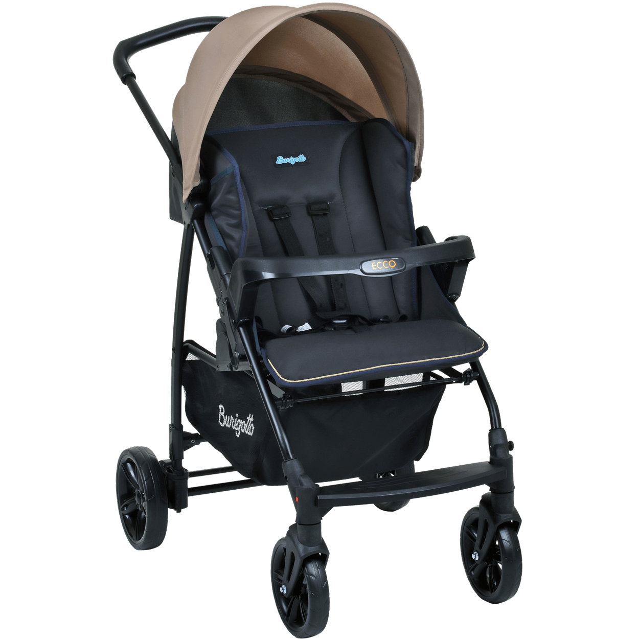 O Ecco Possui Encosto Que Reclina Em 4 Posições, Capota Regulável E Removível, Cinto De Segurança De 5 Pontos, Protetor Frontal Removível, Rodas Dianteiras Giratórias Com Travas, Freio Traseiro Conjugado E Cesto Porta-objetos.