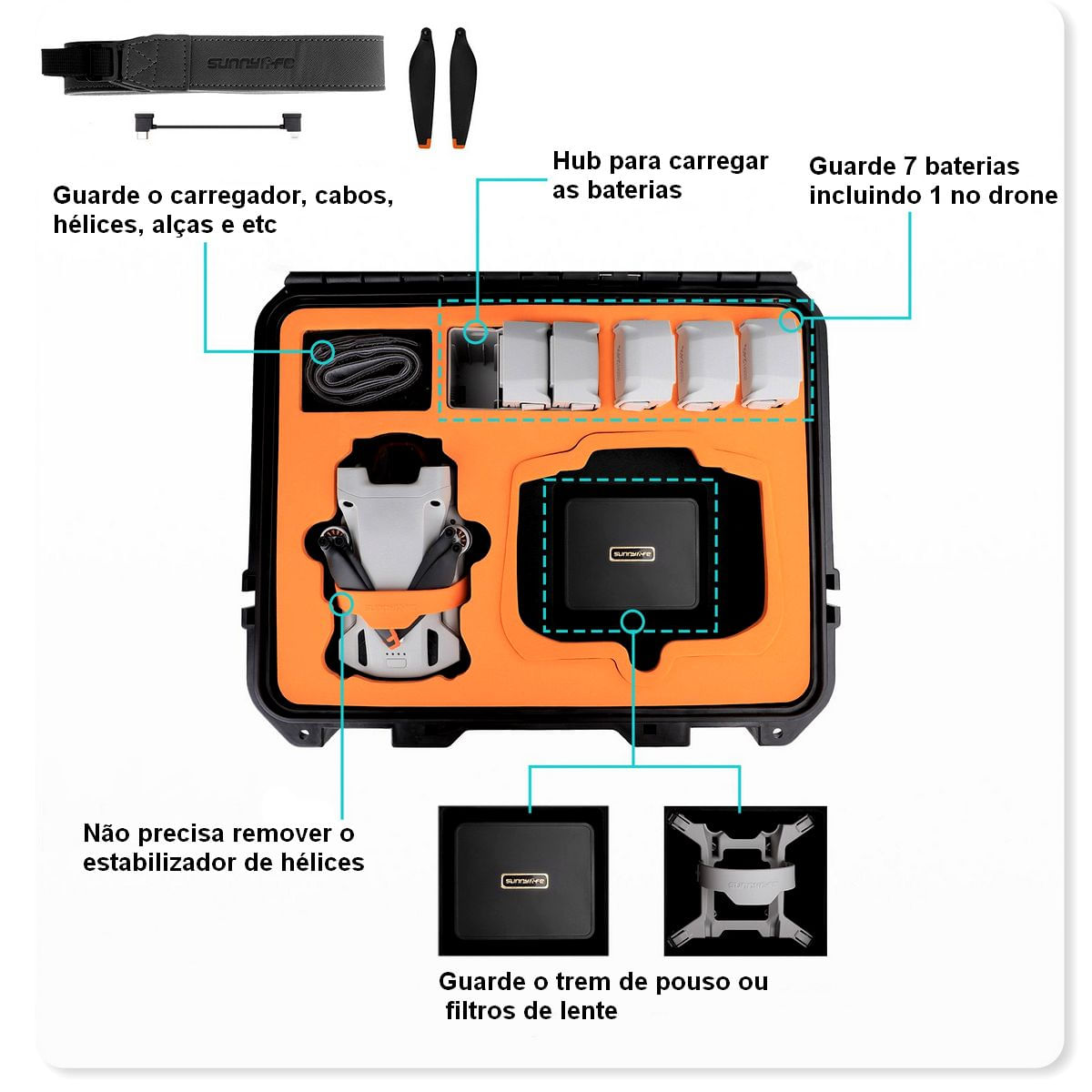 Ela É Super Espaçosa E Com Uma Grande Capacidade De Armazenar Vários Acessórios Como: O Drone, Controle Rc, Rc 2 ou Rc-n1, Hub De Baterias, Até 7 Baterias (incluindo Uma No Drone), Hélices Para Reposição, Cabos, Carregadores, Alças De Segurança, Caixas De Filtro, Trem De Pouso E Muito Mais.
