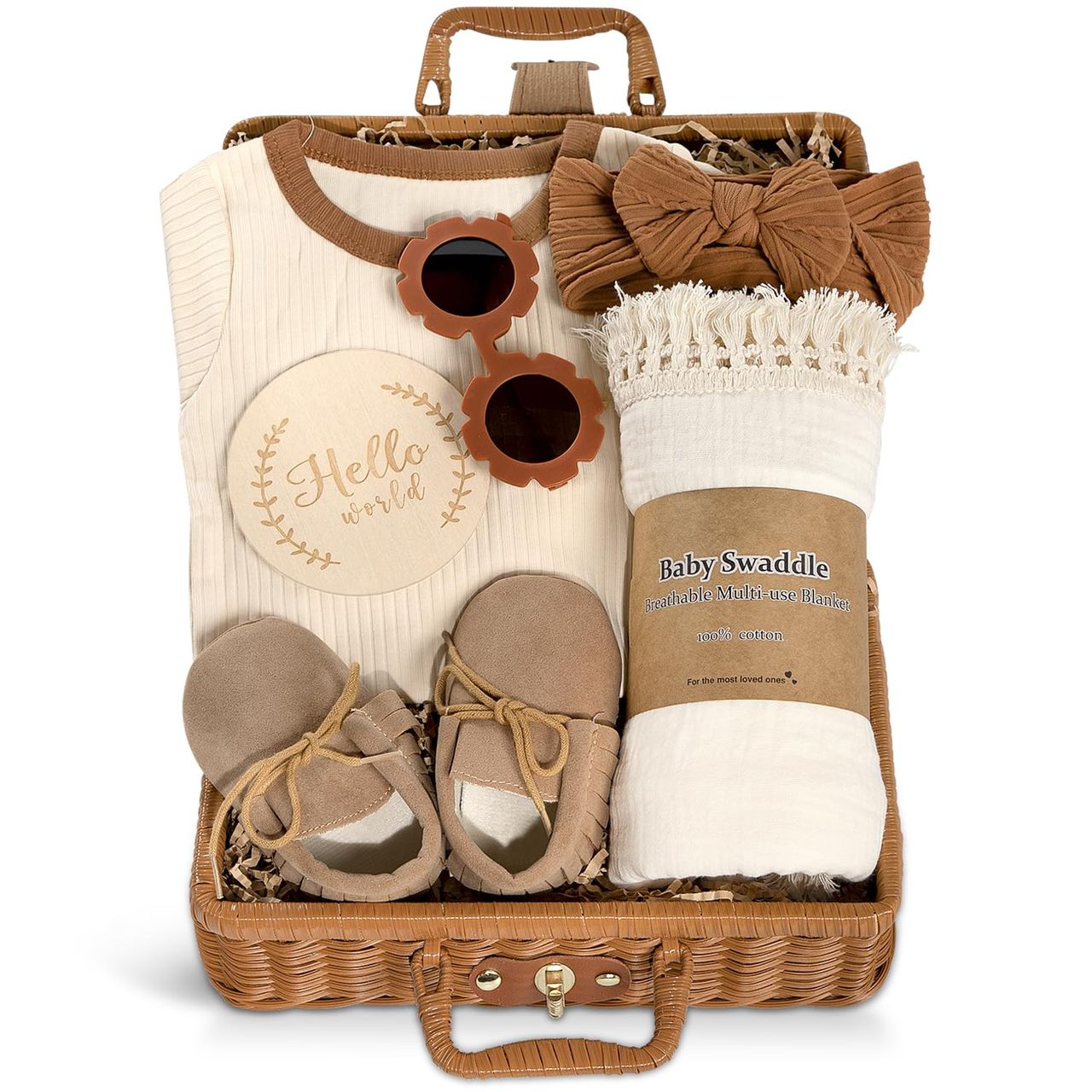 - 【presentes Para Bebês Meninas】os Presentes De Bebê Em Estilo Boêmio Incluem Macacão, Arco De Cabeça, Cobertor De Enfaixar, Óculos De Sol, Sapatos De Borla E Cartões De Marco. Perfeita Para Ocasiões Simples, Chás De Bebê Ou Quando Você Quiser Satisfazer Seus Entes Queridos, Esta Cesta De Presente De Bebê Certamente Agradará.