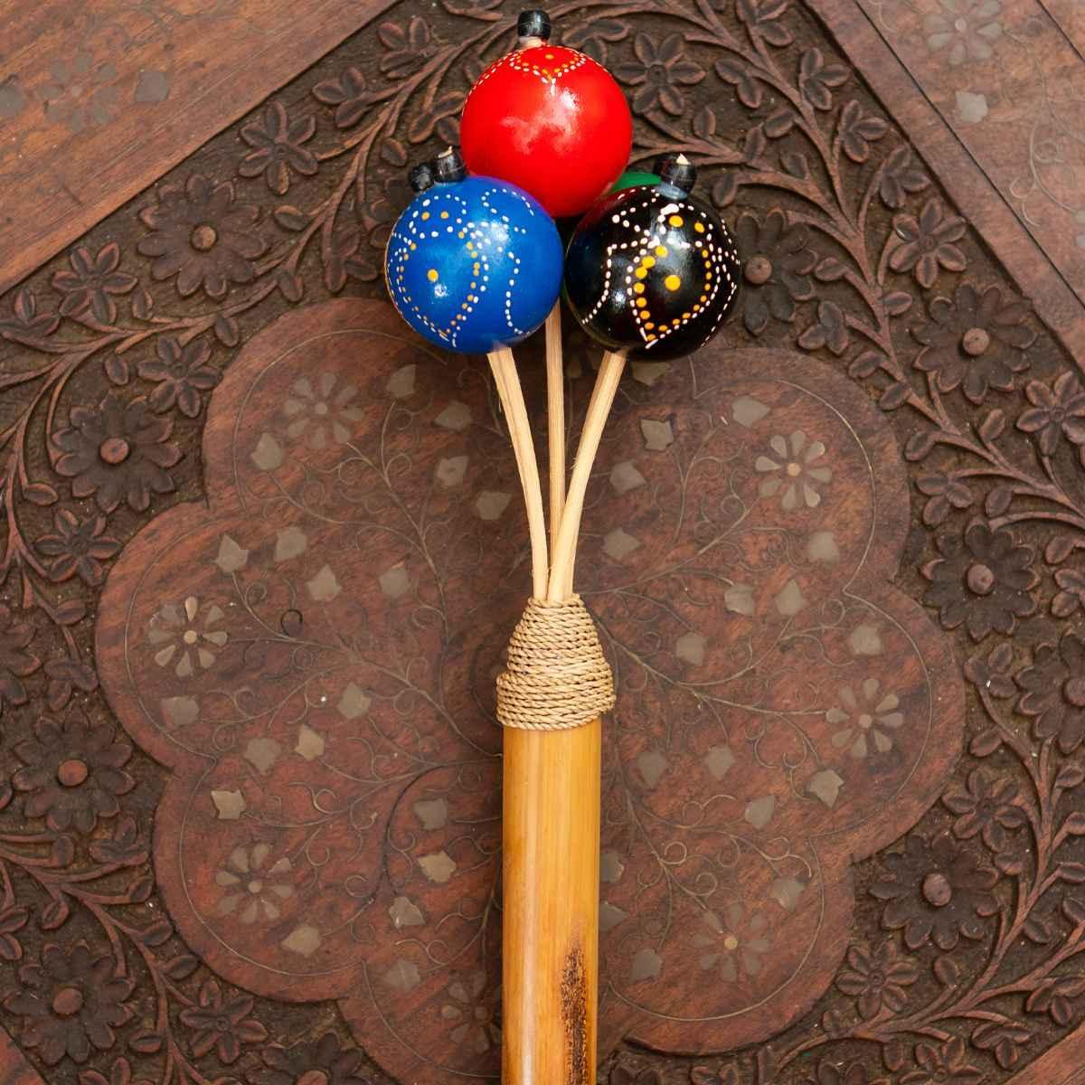 o Chocalho É Um Instrumento Típico Das Danças Latino Americanas E É Um Dos Instrumento Indígenas Mais Conhecidos. Tem Poder De Limpeza Energética E Cura. Possui 5 Cabeças, É Feito De Bambu E É Pintado A Mão. É Um Excelente Instrumento Para Presentear Adultos E Crianças.