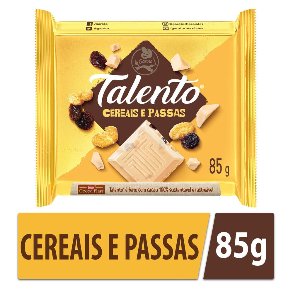Chocolate Branco Garoto Talento Cereais E Uvas Passas Com 85g