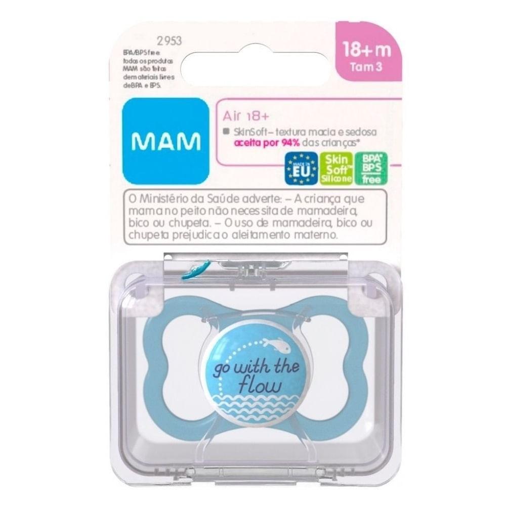 Chupeta Air + 18 Meses Azul Sortida - MAM Baby Possui design inovador, super leve e confortável. Feita de silicone SkinSoft, macio com superfície texturizada e sedosa. Comprovadamente aceita por 94% das crianças. Além disso, possui escudo extra ventilado que mantém a pele seca. Idade recomendada: a partir de 18 meses. Selo INMETRO: CE-PUR/IQB 000265 NBR 10334/2003 OCP 006. IMPORTANTE: Desenho da chupeta pode variar, pois trata-se de item sortido.