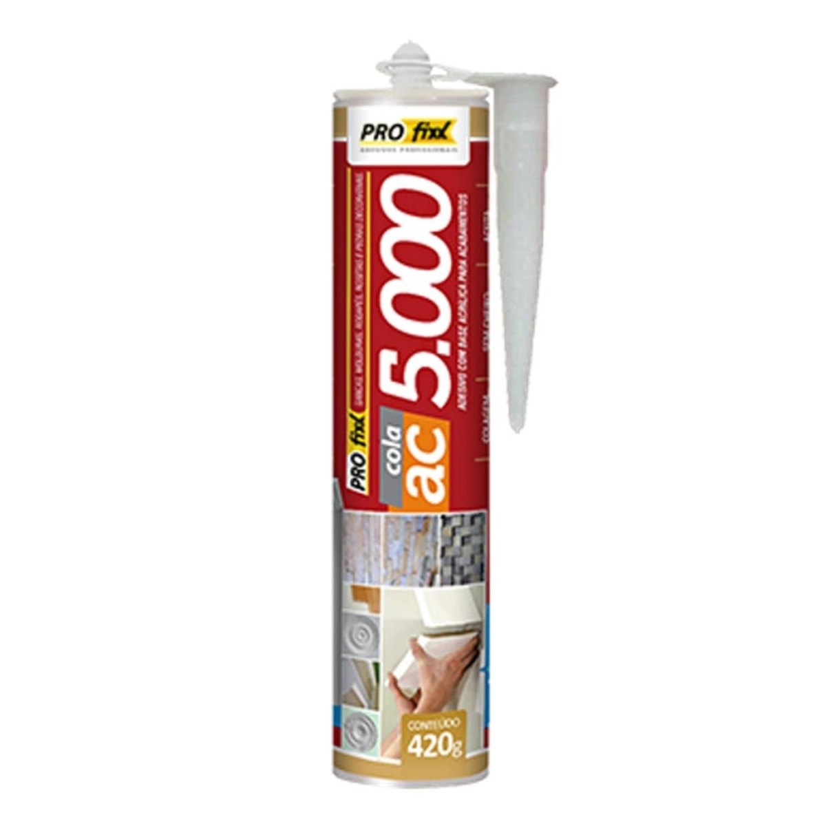 Adesivo Acrílico Cola Rodapé Ac 5000 420g Branco .Produto à base de emulsão acrílica com alto teor de sólidos, de fácil aplicação, especialmente desenvolvida para colagem de objetos de acabamento. .Embalagem prática que facilita a aplicação e reduz o desperdício. .Ótima resistência à tração e compressão em locais com movimentação constante. .Indicação Ideal para fixação de molduras, sancas, rosetas e rodapés em poliestireno, gesso, madeira e MDF além de pedras decorativas, pastilhas e azulejos. .Benefícios Produto pronto para o uso, de fácil aplicação, secagem rápida e alto rendimento. .Preparação da Superfície Eliminar todo pó, manchas de gordura ou graxa, mofo, partes soltas e deixar o substrato livre de qualquer impregnação que possa prejudicar a aderência do produto ao substrato. Se for necessário, lixar e lavar a superfície para deixála firme. .Aplicação do produto .Utilizar pistola de aplicação, espátula de aço lisa ou espátula dentada com dentes pequenos, de no máximo 5 mm para cerâmicas de médio porte e 3 mm para peças pequenas. Aplicar o revestimento imediatamente. Após aplicar o revestimento, pressionar até obter o nivelamento desejado. .Para colagem de molduras, sancas e rodapés, aplicar o produto em forma de cordão, pontos de adesão ou espalhando com espátula. .Rendimento em torno de 12 metros lineares para cada 420g de produto..Tempo de secagem Cura total em 30 minutos .Bisnaga de 420 gramas. .Validade 12 meses a partir da data de fabricação.