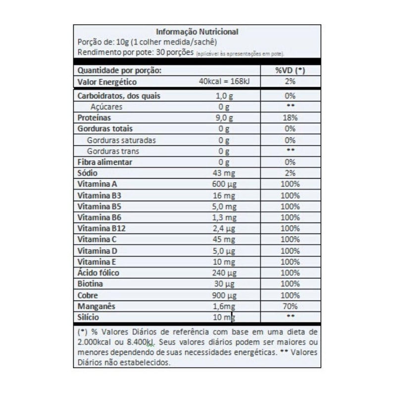 É um suplemento alimentar à base de colágeno hidrolisado, com zero adição de açúcares...Benefícios.A vitamina a auxilia na visão as vitaminas a, b6, b12, c, d, ácido fólico e o cobre auxiliam no funcionamento do sistema imune, as vitaminas a e b3 contribuem para a manutenção da pele e a biotina e o cobre contribuem para a manutenção do cabelo e da pele, as vitaminas b3, b5, b6, b12, c, biotina, o cobre e o manganês auxiliam no metabolismo energético, a vitamina c auxilia na formação do colágeno, o manganês auxilia na formação de ossos e a vitamina d na formação de ossos e dentes, a vitamina d auxilia no funcionamento muscular, o ácido fólico auxilia na síntese de aminoácidos, o cobre auxilia na manutenção dos tecidos conjuntivos e o manganês na manutenção dos tecidos conectivos..Diferenciais.Contém 9,0g de proteína de colágeno hidrolisado por sachê por dose, exclusiva formulação com precursores de colágeno, contem mix de vitaminas e minerais, versão neutra livre de fodmap´s, alta concentração de glicina, aminoácido importante na formação do colágeno...Recomendação:.Dissolva 10g um sachê ou uma colher medida em aproximadamente 250 ml um copo de água ou a bebida de sua preferência e agite com o auxílio de uma colher até total homogeneização. Beba imediatamente após o preparo...Não contém glúten. .Zero açúcar..Este produto não deve ser consumido por gestantes, lactantes e crianças..Não exceder a recomendação diária de consumo indicada na embalagem. Mantenha fora do alcance de crianças..Este produto não é um medicamento...Produto isento de registro de acordo com a rdc 240/2018, anexo i...Fonte fabricante do produto.