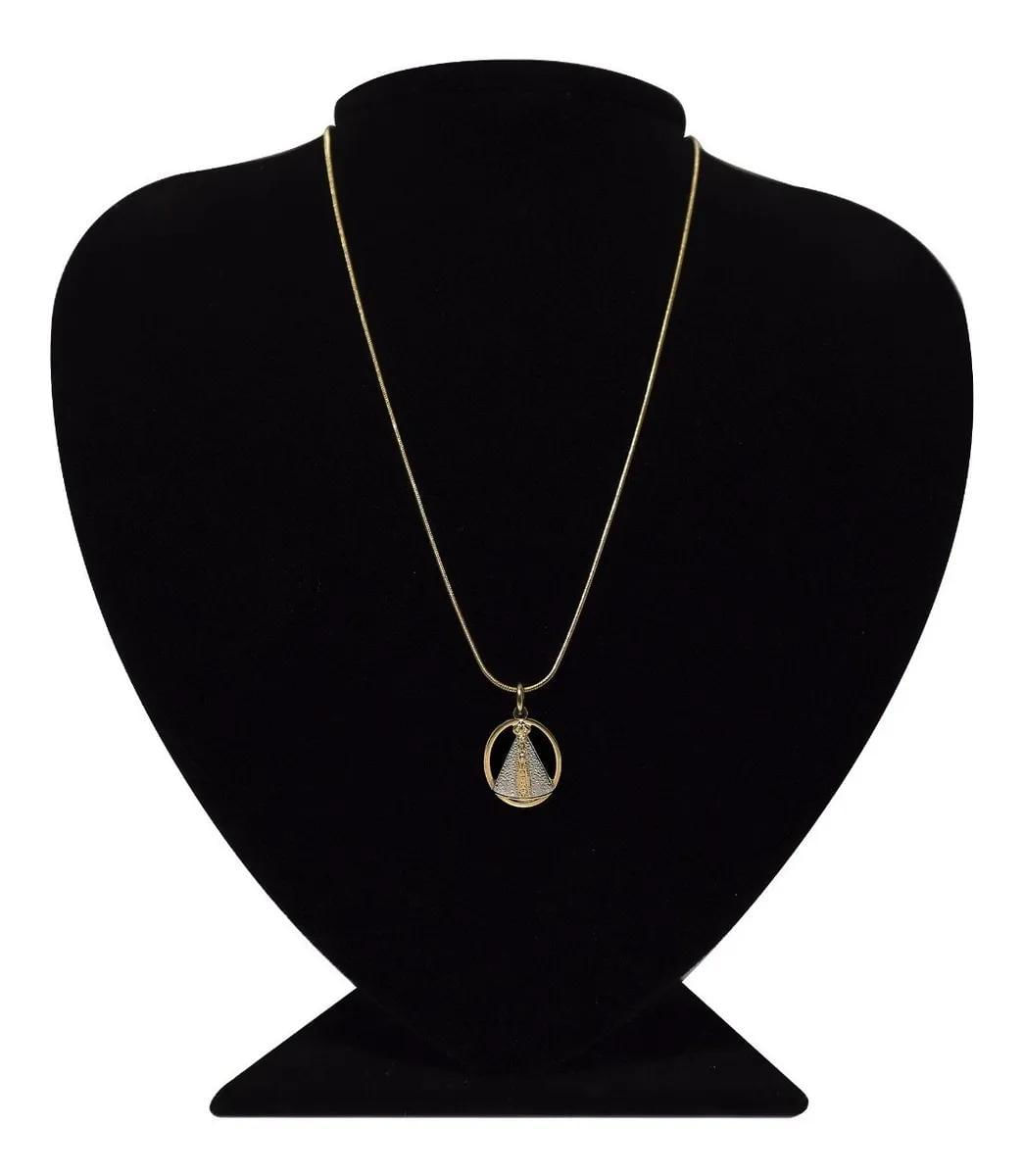 Um Colar Minimalista E Clássico, Com Nossa Senhora Aparecida Colocada Em Um Círculo Dourado De 1,5cm De Diâmetro. Dentro Do Círculo O Manto Prateado Envolve A Imagem Dourada, Esculpida Com Detalhes. O Pingente É Banhado Em Ouro 18k. O Banho Do Pingente É Composto Por 10 Milésimos De Ouro (a Maioria Dos Banhos Do Mercado Tem Entre 3 E 7 Milésimos) E A Corrente Também É Banhada Em Ouro, Desenhada No Elo Rabo De Rato.