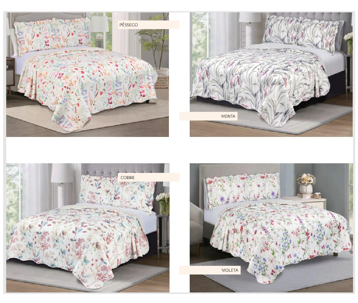 De Alta Qualidade, Tem Enchimento De 100g/m, Oferecendo Leveza E Conforto Térmico Adequado Para Todas As Estações. Os Porta-travesseiros Com Abas Complementam O Conjunto, Garantindo Um Visual Harmonioso E Bem-acabado. Feita Com Materiais Duráveis, A Colcha Garden É Fácil De Lavar E Mantém Suas Cores Vibrantes E A Suavidade Do Tecido Por Muito Tempo. É A Escolha Perfeita Para Quem Busca Elegância, Conforto E Praticidade Em Uma Única Peça.