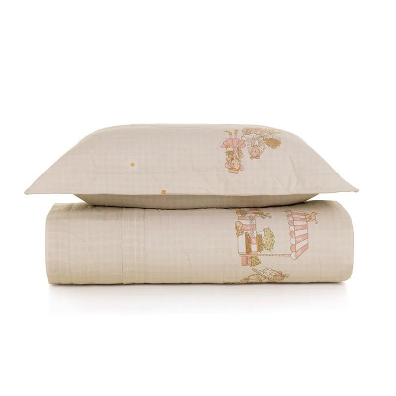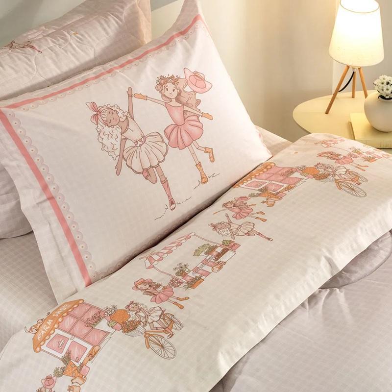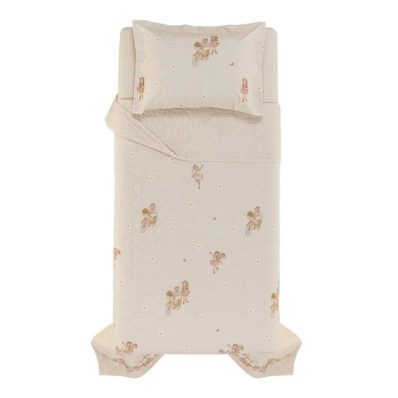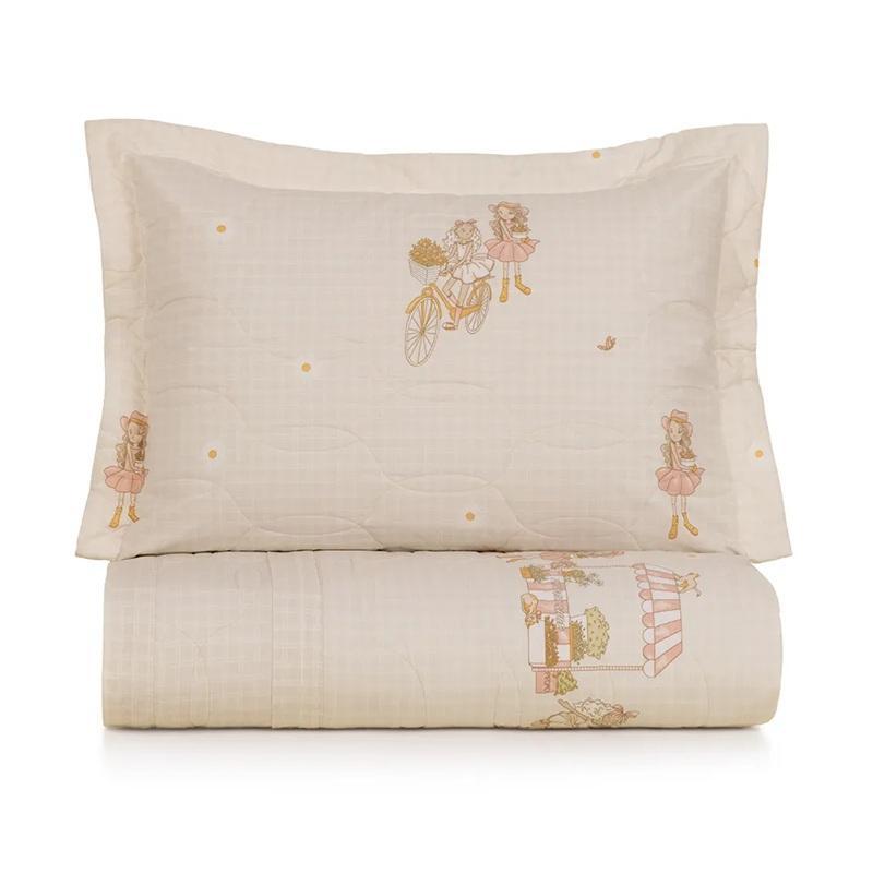 Colcha Solteiro Com Porta Travesseiro 200 Fios 100% Algodão Daisy: O Jogo De Colcha Infantil Daisy No Tamanho Solteiro Com Medidas 1,80m X 2,60m, Traz Delicadeza E Aconchego Para O Universo Infantil Produzido Em 100% Algodão Possui 200 Fios, Perfeito Para As Crianças Dormirem Confortáveis E Acordarem Cheias De Energia. A Colcha Dupla Face Com Cantos Quadrados É Prática E Cheia De Estilo, Permitindo Variar A Decoração Do Quarto Com Facilidade. Os Porta-travesseiros De 50cm X 70cm Com 3 Abas De 5cm Completam O Visual Com Um Toque Encantador. Feito Com Tecido Hipoalergênico, Respirável E Resistente A Bolinhas, É Seguro E Ideal Para A Pele Sensível Das Crianças. O Fundo Bege Apresenta Estampas Meigas E Bailarinas, Combinando Delicadamente Com O Edredom E Jogo De Cama Da Mesma Linha.