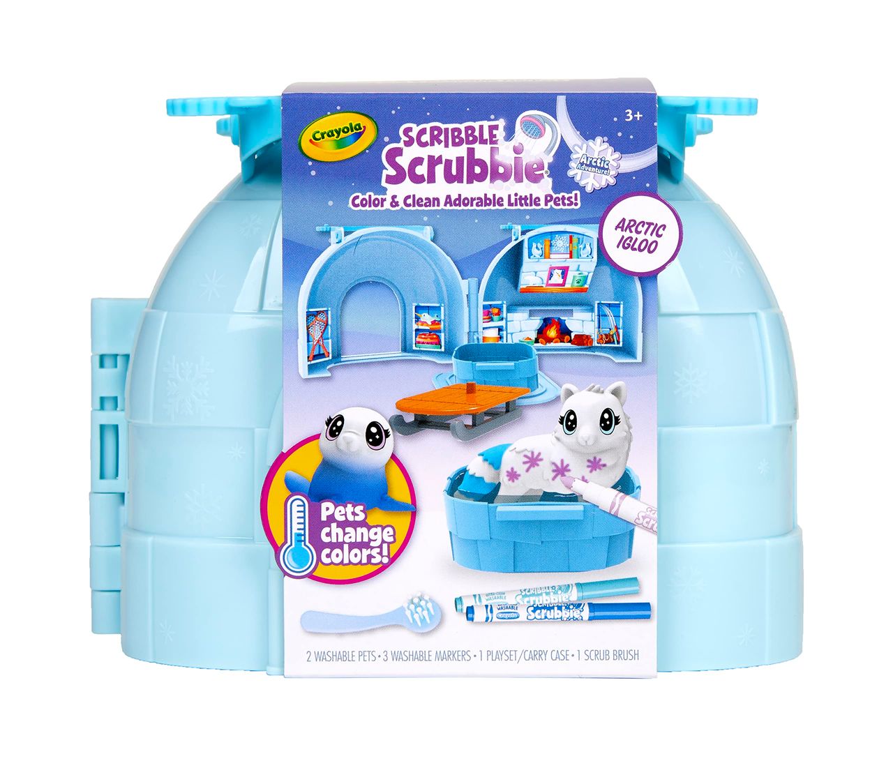 - Crayola Igloo Scribble Scrubbie Arctic Pets Igloo: Inclui 1 Ambiente Iglu De Plástico Que Funciona Como Um Estojo De Armazenamento Com Alças Dobráveis, 2 Novos Animais De Estimação Que Mudam De Cor (anco/morsa E Estrela/raposa Ártica), 3 Marcadores, 1 Escova E 1 Banheira De Plástico.