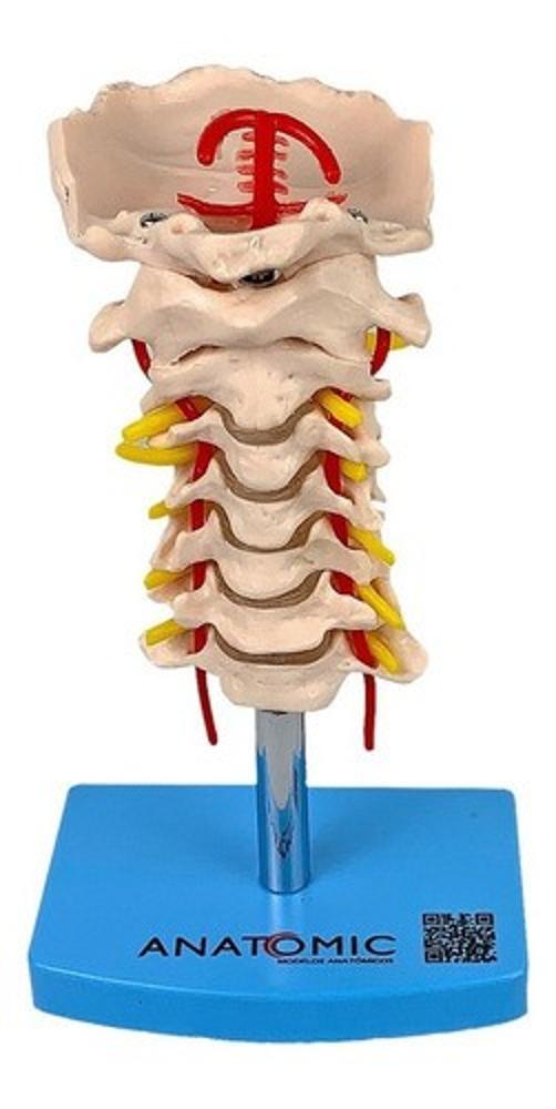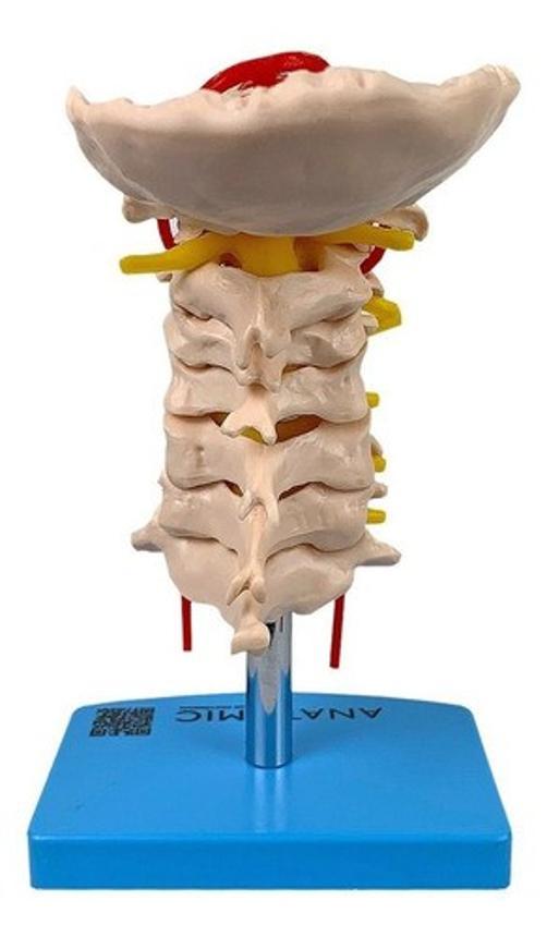 Modelo Anatômico Da Coluna Vertebral Cervical, Em Tamanho Natural, Com Lâmina Do Osso Occipital, Vertebras Cervicais Com Discos Intervertebrais, Nervos E Artérias Cervicais. Confeccionado Em Resina Plástica. Montado Em Haste De Metal E Fixo Em Base.