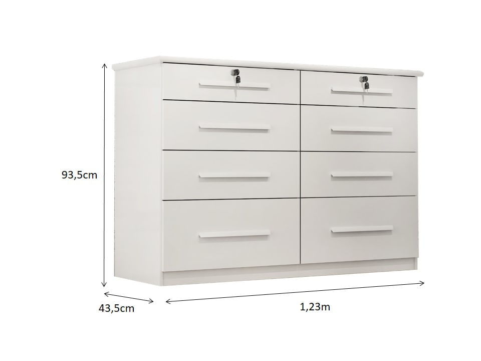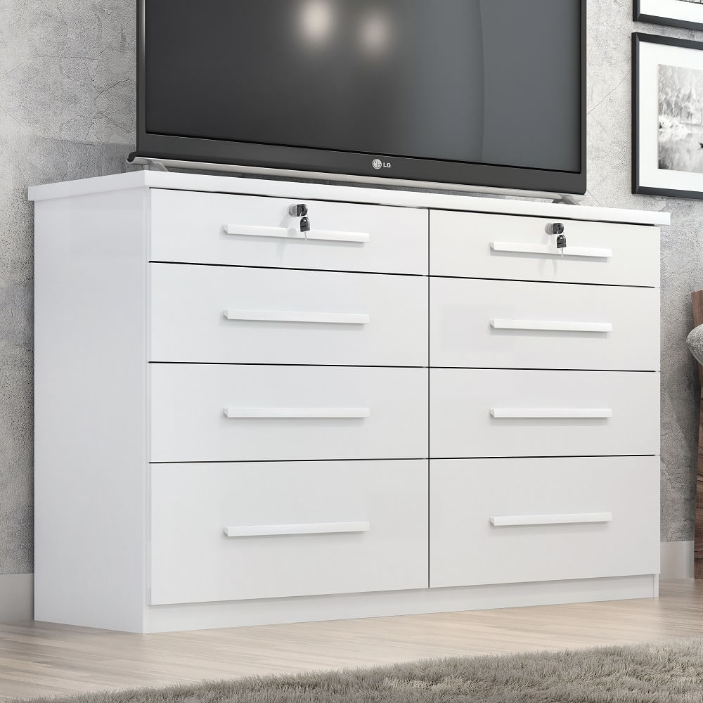 Cômoda Monza com 8 gavetas, dispõe de um design sofisticado e é própria para pessoas exigentes com organização. Possui um tampo de 25 mm que enobrece o produto e o deixa mais resistente e belo.