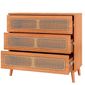 Comoda De 105cm Com Tres Gavetas, Produzida 100% Em Mdf, Acabamento Pintura Uv 7 Camadas Na Cor Freijo, Corrediças Metálicas Telescópicas, Acabamento Das Frentes De Gaveta Em Palha Natural, Pés Palito De Madeira Natural.