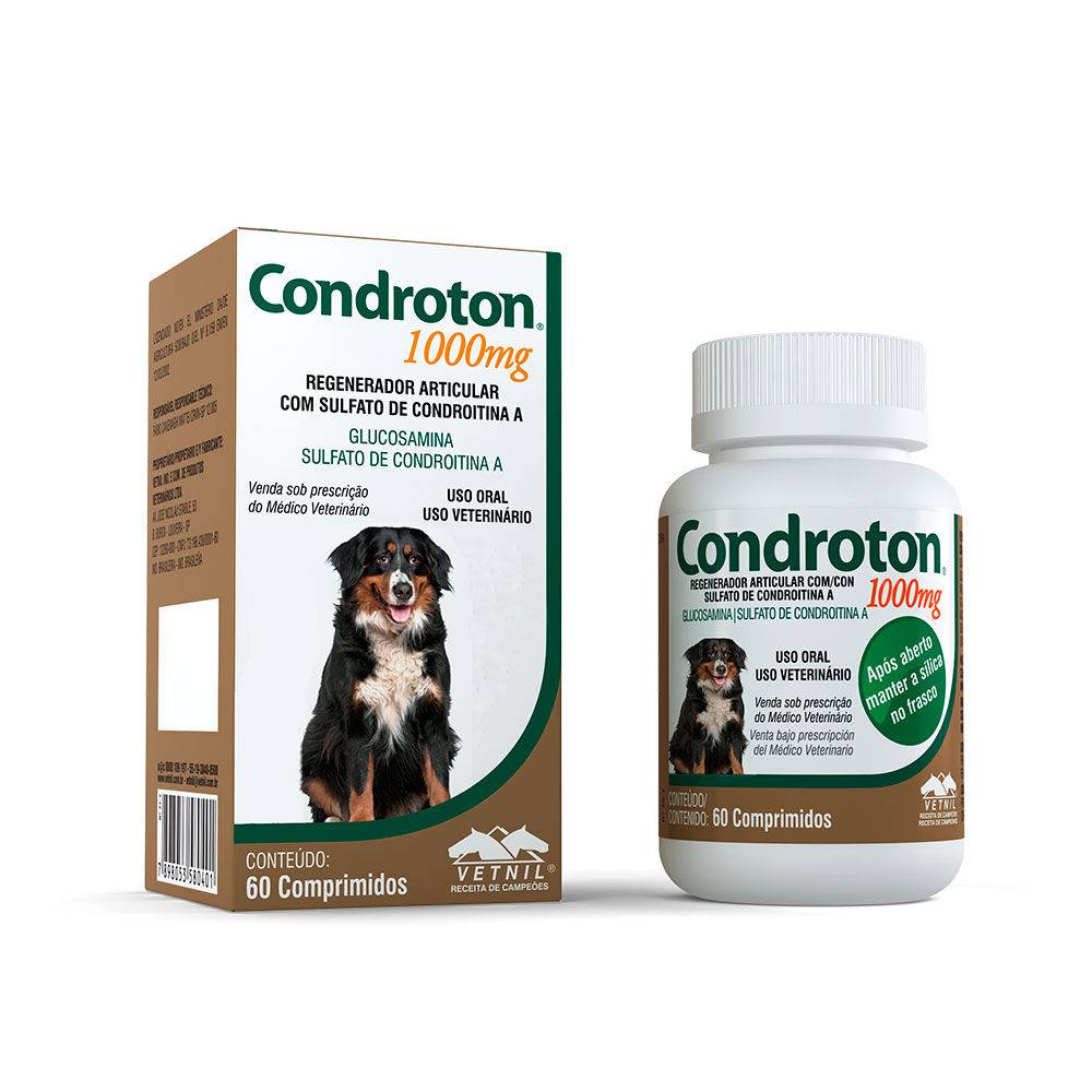 Condroton Vetnil 1000mg é indicado para auxiliar os tratamentos de artropatias não infecciosas, patologias tendíneas, osteodistrofias e condrodistrofias, pós-operatório de cirurgias articulares, coadjuvante em casos de fraturas, além de atuar também na profilaxia de doenças osteoarticulares e condro-proteção de animais submetidos a grandes esforços. Contém 60 comprimidos.
