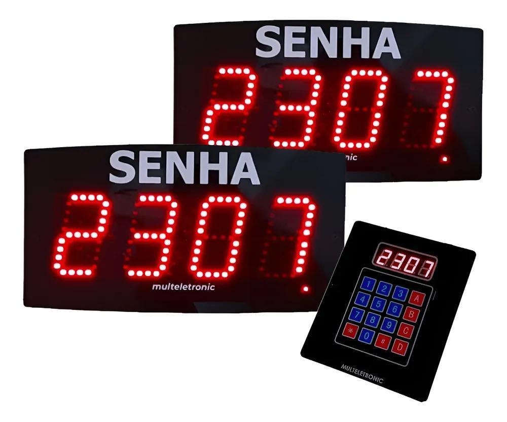 Conjunto com 2 Painéis de Senha Digital Multeletronic e 1 Teclado Senha para Chamada de Senhas Aleatórias. Útil para quando você precisa exibir as senhas em ambientes maiores, que requerem exibição da senha em ângulos ou locais diferentes. O mesmo teclado pode ser utilizado para chamar a senha nos dois painéis simultaneamente, e permite chamar senhas comuns e preferenciais.