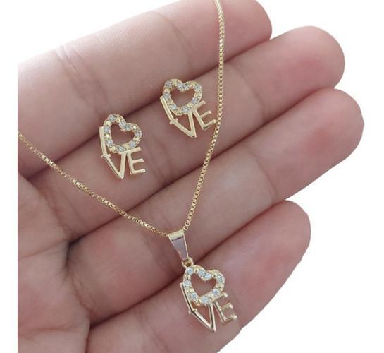 adquira Agora Mesmo O Conjunto Colar E Brinco Love Coração Pedra Folheado Amor E Desfrute De Toda A Beleza E Elegância Que Essa Peça Tem A Oferecer.