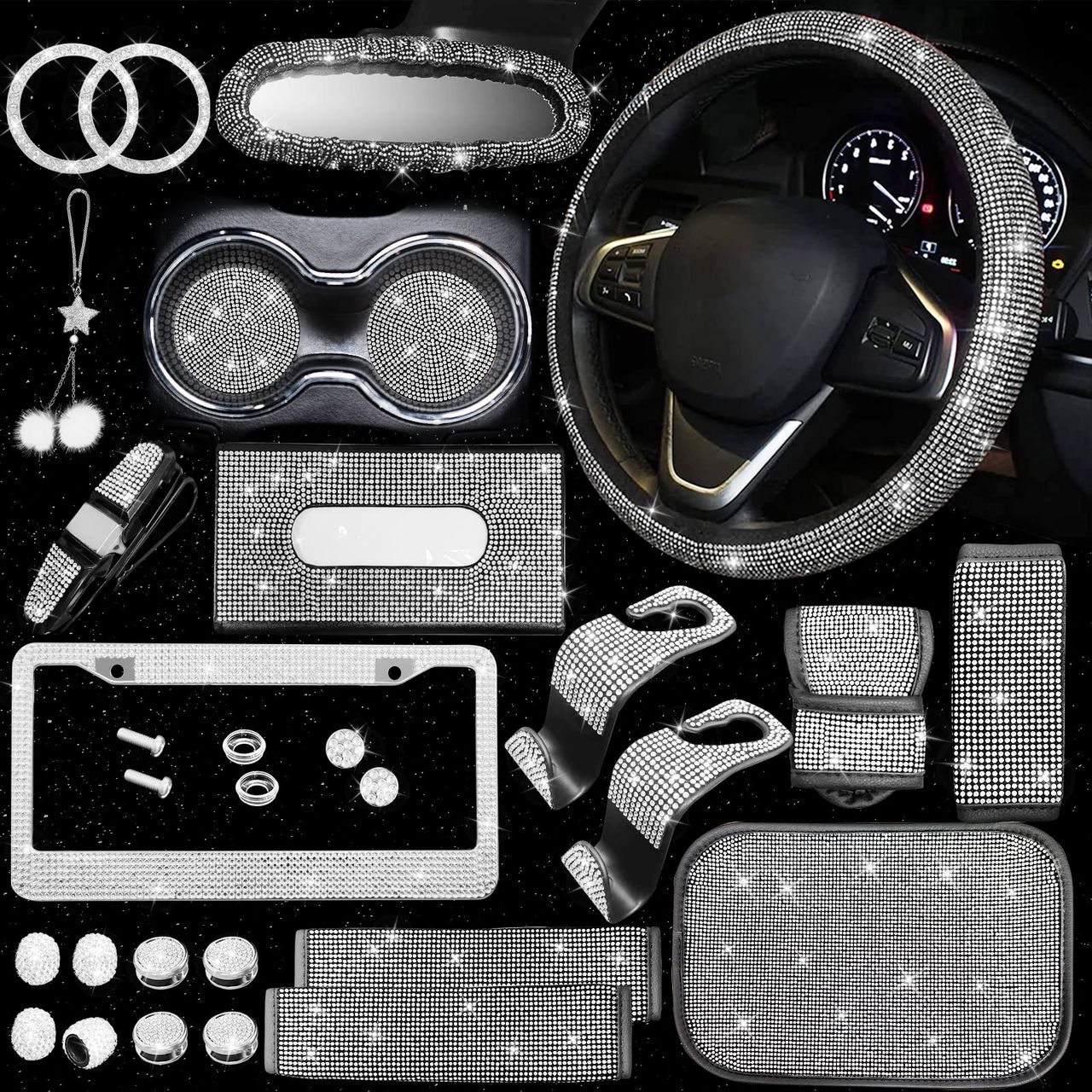 - [refeição De Valor]: Você Receberá 25 Acessórios De Carro Brilhantes Para Mulheres, Incluindo Uma Capa De Volante Brilhante, Uma Capa De Freio De Mão Brilhante, Uma Capa De Câmbio Brilhante, 2 Alças De Ombro De Segurança Brilhantes, Uma Almofada De Apoio De Braço Brilhante, Uma Capa De Espelho Retrovisor Brilhante, Um Suporte De Placa De Licença Brilhante E Uma Caixa De Lenços, 1 Clipe De Óculos De Sol Brilhante, 4 Mini Ganchos Brilhantes, 2 Brilhantes Porta-copos 2 Anéis De Arranque Brilhantes, 2 Ganchos Traseiros Brilhantes, 4 Narizes De Ar De Carro Brilhantes.