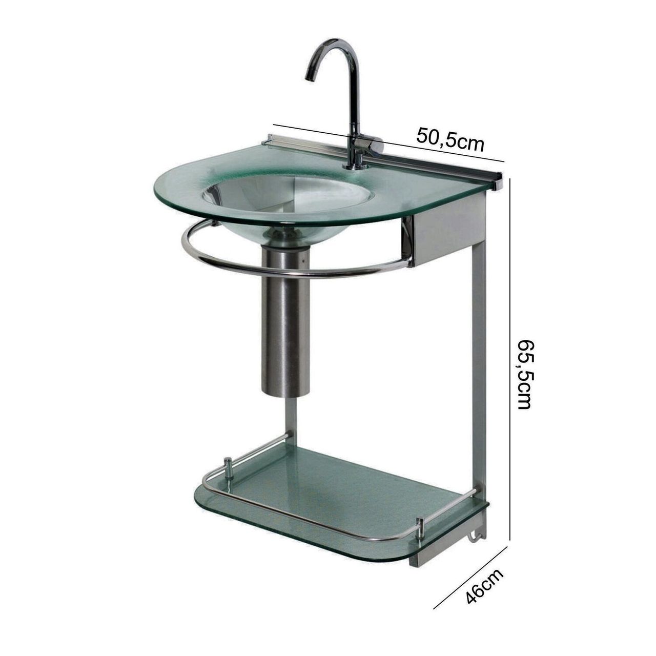 Conjunto De Lavabo Que Acompanha Um Exclusivo Espelho, Tampo De Vidro De 10mm Com Cuba Moldada, Com Válvula Exclusiva Produzida Internamente, Estrutura Reforçada Em Alumínio Capa De Proteção Do Sifão Em Alumínio, Porta Toalha Integrada Ao Lavabo Prateleira Em Vidro.