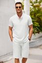 - 【camisa De Praia De Verão】conjunto Masculino De 2 Peças Com Gola Henley, Fecho De Botão, Textura De Linho, Mangas Curtas E Punhos Enrolados. O Traje De Férias Masculino Possui Cordão Elástico Na Cintura, Oferecendo Espaço Suficiente Para A Cintura E As Pernas Para Se Movimentar Mais Livremente.