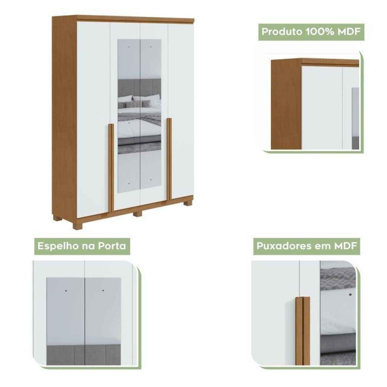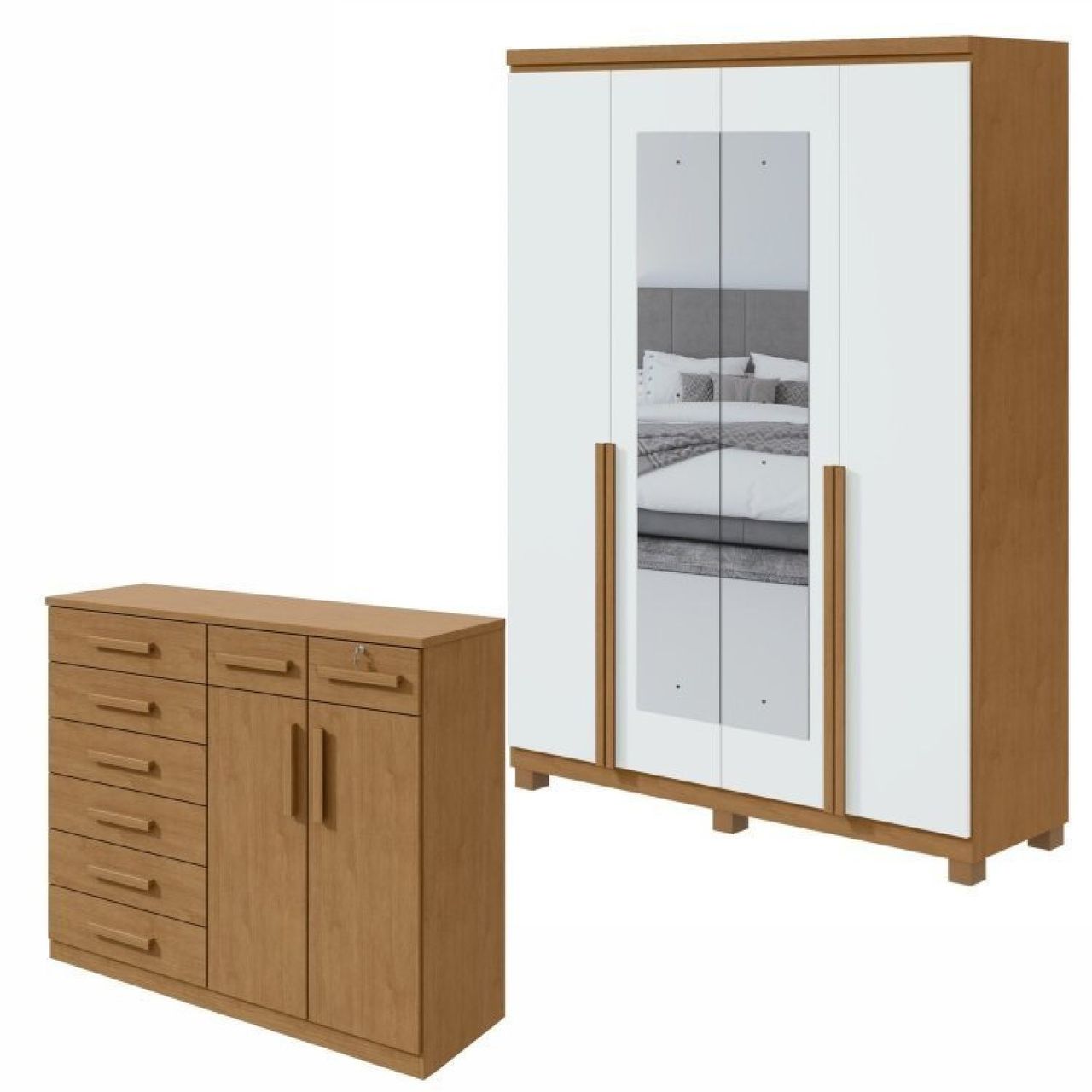 Conjunto De Guarda-roupa Alonzo Com Espelho E Pés E Cômoda Toronto Amêndoa Clean/branco.