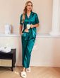 Conjunto De Pijama Feminino De Manga Curta Com Botões No Quadril, Gola Virada Para Baixo, Calça Com Cordão Elástico Na Cintura Para Tornar O Relaxamento O Mais Confortável Possível.