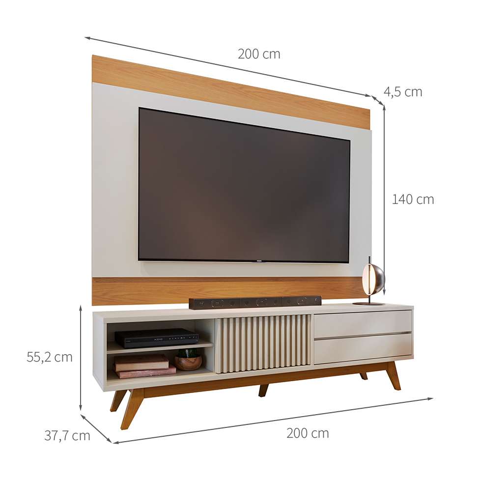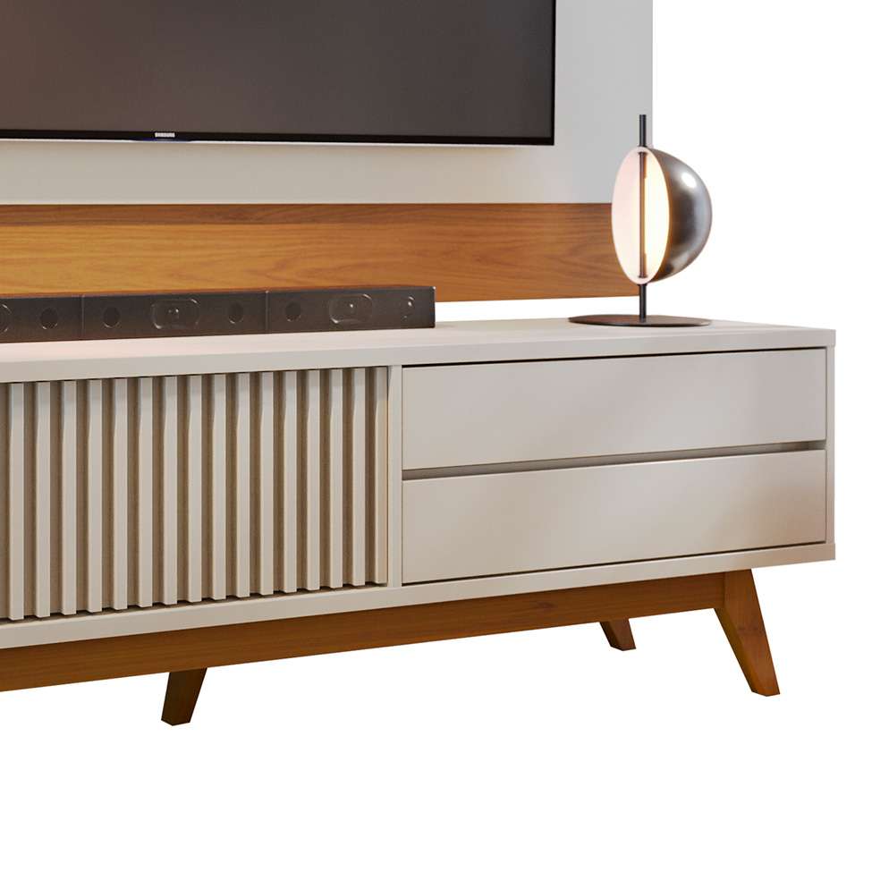 Que Tal O Rack Veneza Com Painel Nilo? Procurando Os Móveis Certos Para Montar O Centro De Entretenimento Dos Sonhos? Então O Rack Veneza Com Painel Nilo Vai Te Ajudar! Enquanto A Bancada É Multifuncional, Podendo Acomodar Receptores De Sinal, Videogames Ou Peças Decorativas, O Painel Recebe Uma Tv De Até 75 Polegadas E Transforma O Ambiente Em Um Verdadeiro Cinema Em Casa. Já O Visual Contemporâneo E Sofisticado Torna Simples Combinar O Kit Com A Decoração, Afinal, A Cor Neutra E O Acabamento Amadeirado Nunca Saem De Tendência.