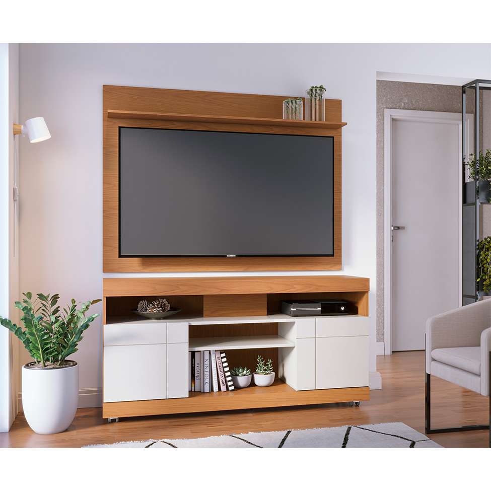 Que Tal O Rack Yara Com Painel Maia? Procurando Os Móveis Certos Para Montar O Centro De Entretenimento Dos Sonhos? Então O Rack Yara Com Painel Maia Vai Te Ajudar! Enquanto A Bancada É Multifuncional, Podendo Acomodar Receptores De Sinal, Videogames Ou Peças Decorativas, O Painel Recebe Uma Tv De Até 55 Polegadas E Transforma O Ambiente Em Um Verdadeiro Cinema Em Casa. Já O Visual Contemporâneo E Sofisticado Torna Simples Combinar O Kit Com A Decoração, Afinal, A Cor Neutra E O Acabamento Amadeirado Nunca Saem De Tendência.