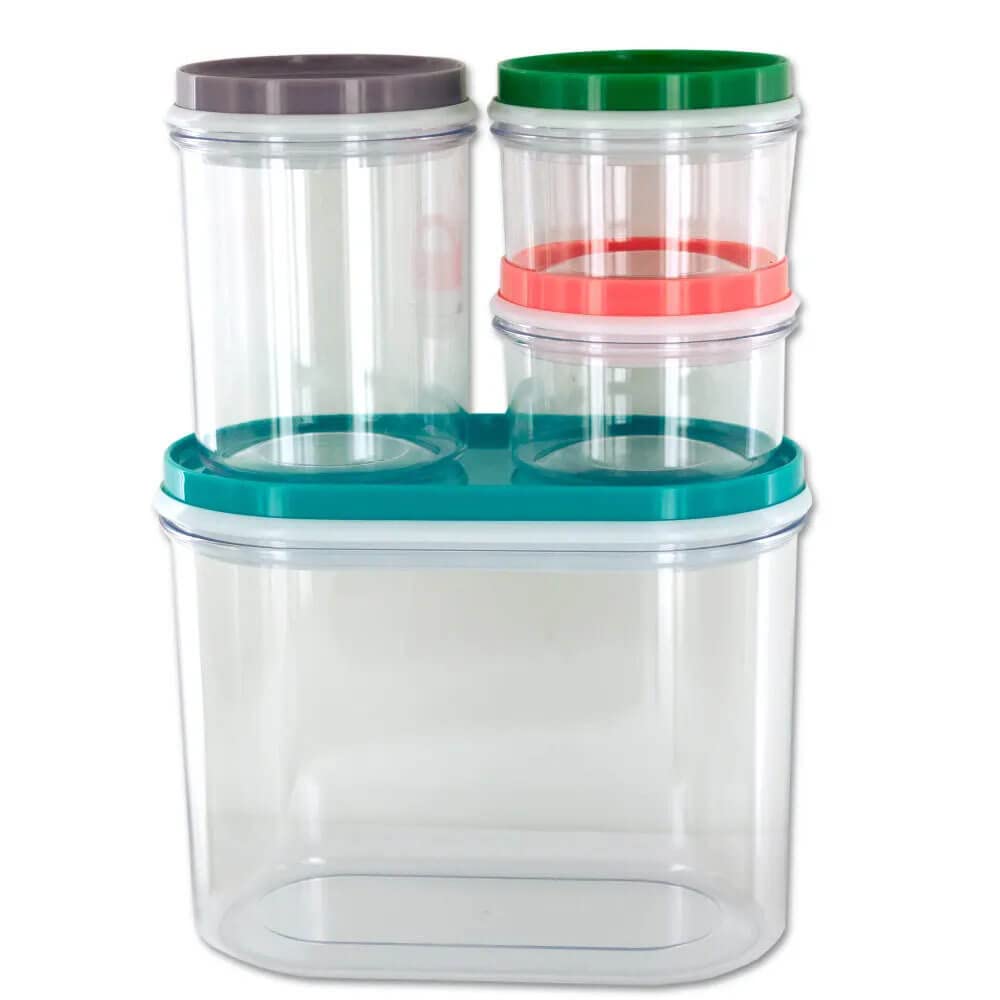 - Perfeito Para Armazenar Alimentos Secos, Itens De Artesanato E Muito Mais, Este Conjunto De Recipientes Multiuso De 4 Peças Possui Recipientes De Plástico Durável Com Tampas Coloridas Herméticas.