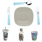O Conjunto É Composto Por Um Copo Com Capacidade De 320 Ml, Um Copo Com Canudo De 700 Ml, Uma Garrafa Com Alça De 500 Ml, Um Pratinho Raso, Um Pratinho Fundo E Um Conjunto De Talheres Com Colher, Faca E Garfo. Cada Conjunto Contém Uma Unidade De Cada Item Mencionado.