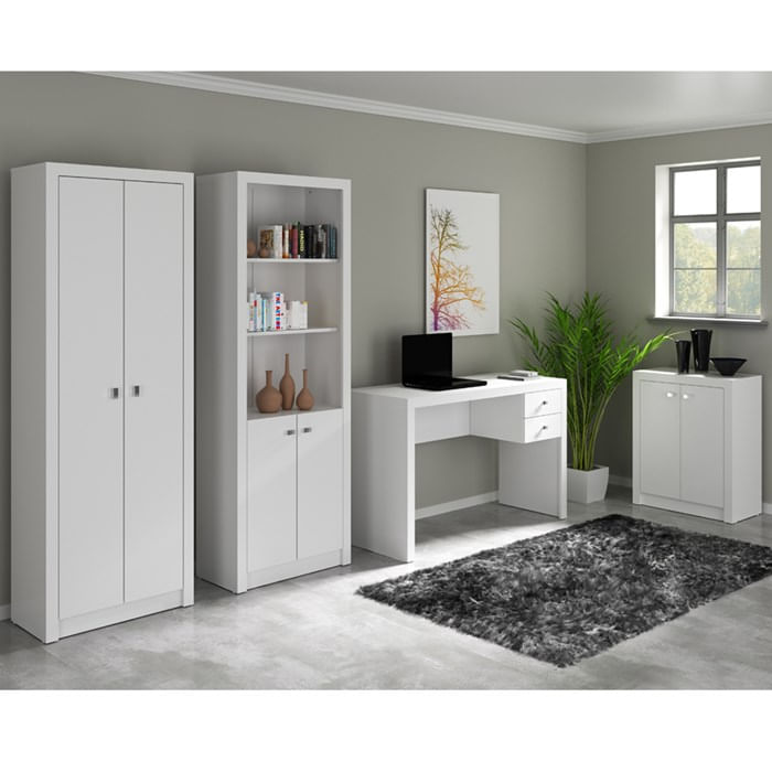 Conjunto Para Escritorio Tecno Mobili, móveis de qualidade que oferecem durabilidade e resistência, com estrutura em MDP de 15mm, pintura com acabamento em BP (Fosco). Escrivaninha possui 02 gavetas com corrediças metálicas que suportam até 3 kg cada, gavetas com montagem inversa, você escolhe o lado que quer montar as gavetas, Armários possui portas com dobradiças metálicas, prateleiras resistentes que suportam até 12 kg cada, tampo do balcão é super resistente suporta até 13 kg, conta com puxadores modernos, possui amplo espaço interno para organizar a papelada do trabalho ou os livros de estudo, este Conjunto Escritório da Linha Tecno Mobili, possui diversas peças que são vendidas separadamente, são ideais pra você compor o melhor projeto pra seu escritório. Estes móveis chegarão em sua casa separados em 04 volumes...Dimensões.1x Mesa Escrivaninha Cód. ME4123.0001.Alt 74,5 cm.Larg 117 cm.Prof 46,5 cm..1x Armário 2 Portas Cód. ME4105.0001 .Alt 171,5 cm.Larg 60 cm.Prof 31,8 cm..1x Armário 2 Pt 2 Prat Cód. ME4110.0001.Alt 171,5 cm.Larg 60 cm.Prof 31,5 cm..1x Balcão 2 Portas Cód. ME4103.0002.Alt 74,5 cm.Larg 60 cm.Prof 31,5 cm..Sistema de Montagem.Parafusos, minifix e cavilhas...Recomendação de Limpeza.Limpar com pano seco para retirar o pó. Não aplicar produtos abrasivos...Produtos de Enfeite e Eletrônicos Não Estão Inclusos..... .Importante saber.As imagens são meramente ilustrativas, não acompanham objetos de decoração e eletrônicos..A tonalidade da cor do produto pode variar de acordo a calibração de cores do seu monitor, a iluminação do ambiente ou sua percepção visual..Ao receber a mercadoria, o cliente deve verificar a quantidade de VOLUMES descritos na nota fiscal, as condições da embalagem, caso haja alguma avaria não assine o comprovante de recebimento..Montagem, desmontagem e outras instalações serão de responsabilidade do cliente..Não nos responsabilizamos, no ato da entrega, por subir escadas/elevadores ou pelo transporte por guincho em apartamentos. Eventuais despesas são de responsabilidade do comprador..Confira as dimensões do produto e certifique-se de que passarão normalmente por supostos elevadores, portas, escadas ou corredores de sua residencia..Entregamos os produtos até a frente de sua moradia, ou seja, até sua porta se for casa ou portaria se for apartamento..O prazo de entrega informado na página do produto e no carrinho é mera previsão, podendo variar dependendo da região, bem como ser alterado após a realização do pedido em razão de fatores externos, tais como a: extravio/roubo/furto/avaria da mercadoria, greves, isolamento social, etc..Entregamos somente em endereços que possuam acesso rodoviário seguro e sem restrições..Nas entregas realizadas por transportadoras, no momento do recebimento o comprador ou a pessoa que receber os produtos DEVE VERIFICAR SE OS PRODUTOS RECEBIDOS correspondem ao mesmo modelo e à mesma quantidade dos produtos adquiridos.. ..Garantia de fábrica.90 dias para eventuais defeitos de fabricação.. .. . .. . ...