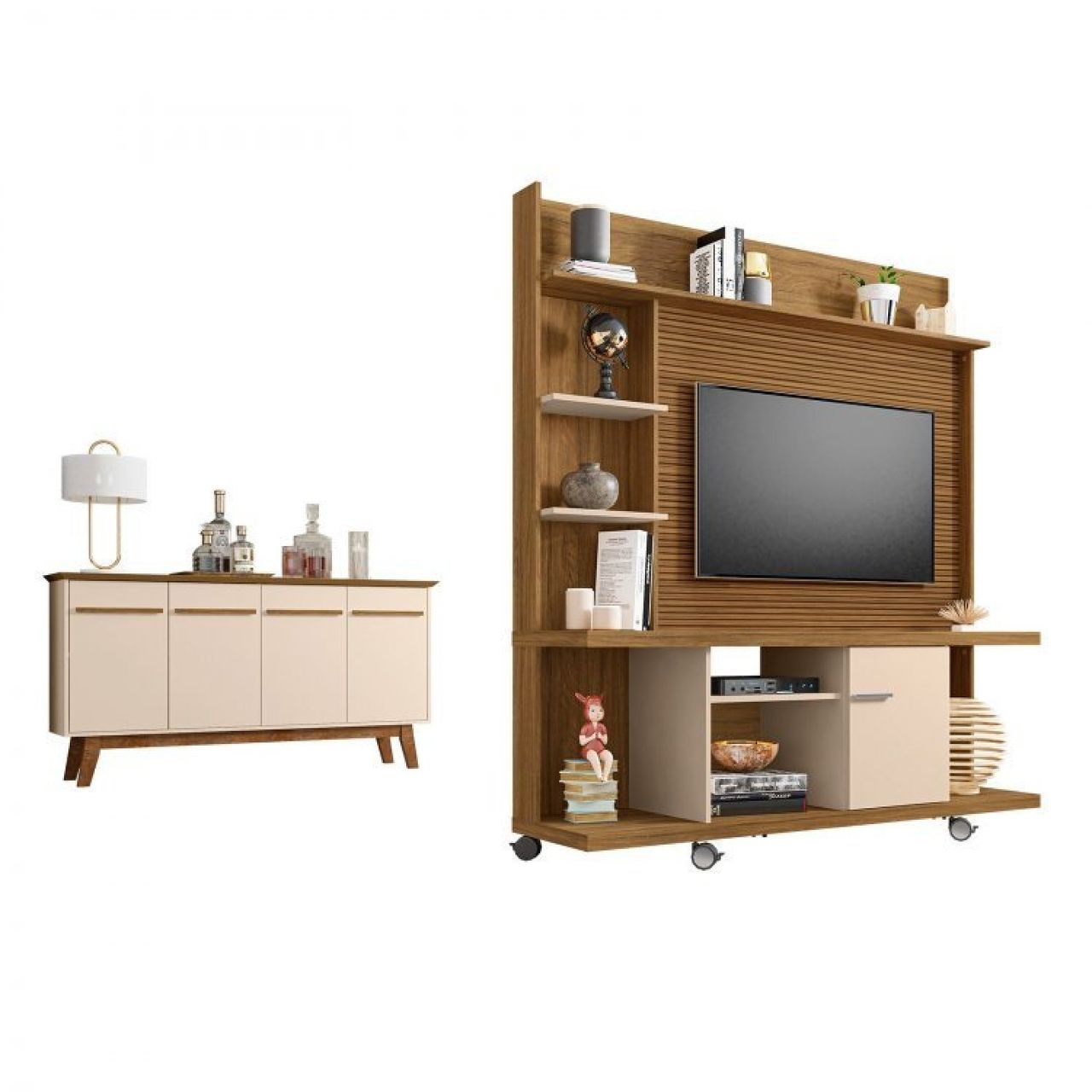 Kit 2 Peças Com Estante Para Tv De Até 47 Polegadas E Buffet 3 Portas Com Pés De Madeira Maciça Cinamomo/off-white/ripado.
