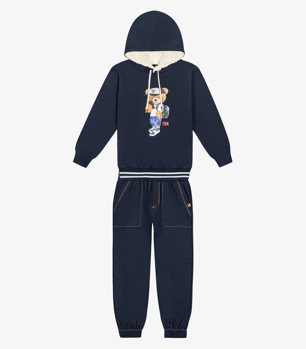 O Conjunto Infantil Blusão Com Calça Trick Nick Redefine O Estilo Infantil Com Sua Composição Inovadora. O Blusão, Confeccionado Em Moletom, Pelo Sintético E Molecotton Denim, Oferece Conforto E Sofisticação. Seu Forro Interno Proporciona Aconchego, Enquanto O Aplique Toque Zero Termocolante E Estampa Destacam A Atenção Aos Detalhes. A Calça, Com Cós Elástico E Bolso Sobreposto, Garante Praticidade E Ajuste Perfeito. Este Conjunto É A Escolha Ideal Para Os Pequenos Que Buscam Moda E Conforto.