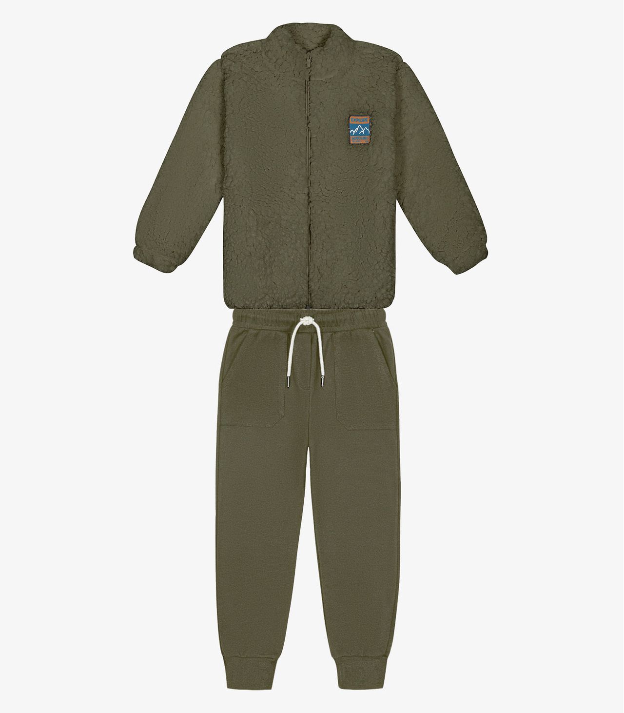 O Conjunto Infantil Casaco Com Calça Trick Nick É A Escolha Perfeita Para Os Pequenos Fashionistas. O Casaco, Confeccionado Em Pelo Sintético Carneirinho, Proporciona Conforto E Um Toque De Sofisticação, Com Gola Alta, Patch Aplicado E Zíper De Nylon Para Praticidade. Os Bolsos Laterais Adicionam Funcionalidade Ao Visual. A Calça, Em Meia Malha E Moletom, Apresenta Cós Colocado Com Elástico Para Ajuste Ideal, Cadarço Funcional E Bolso Sobreposto, Garantindo Um Conjunto Completo.