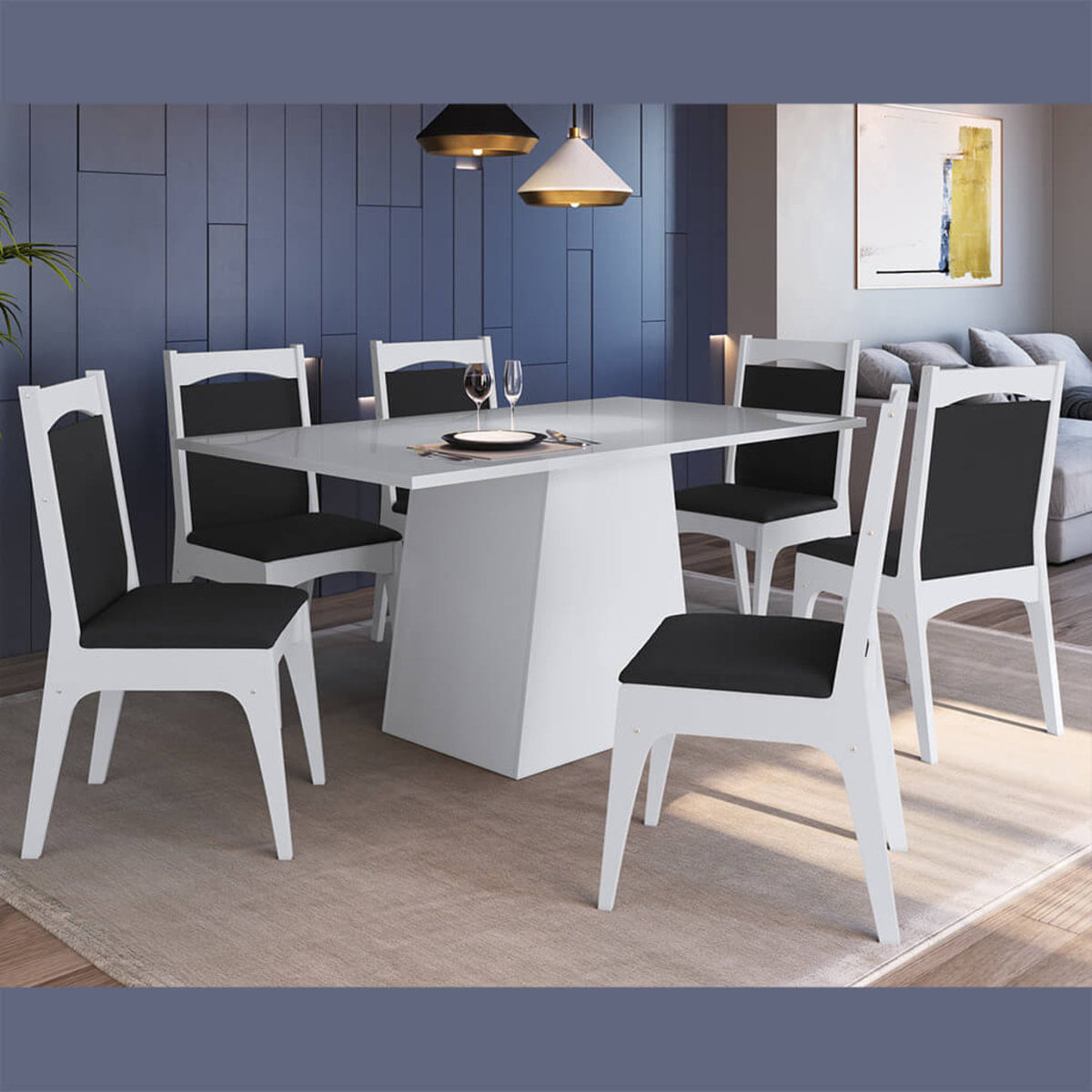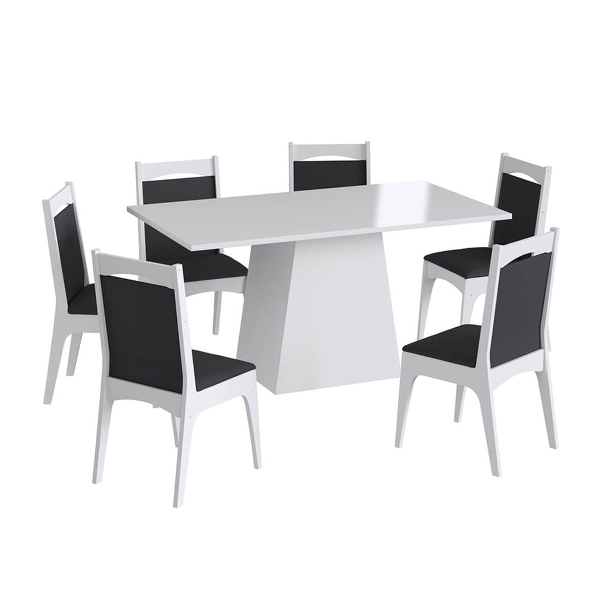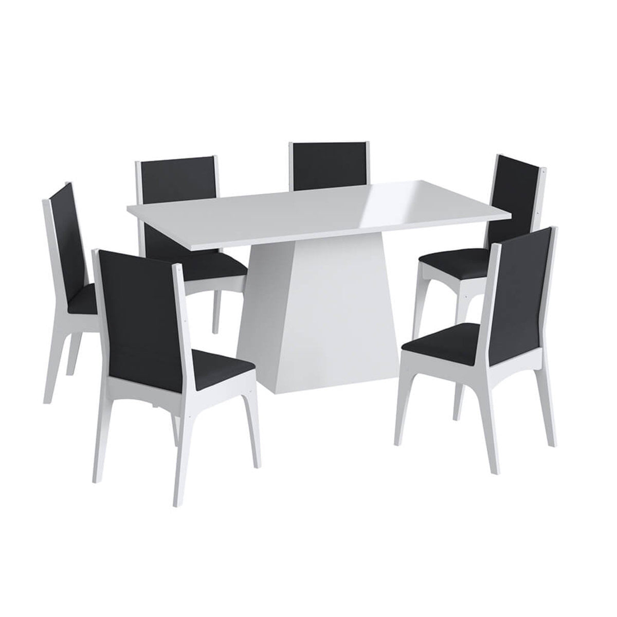 Conjunto mesa em MDP com base e 6 Cadeiras em MDF branco e preto Lilies Móveis Esse conjunto é composto por uma mesa com base e 6 cadeiras na cor branca, em MDF com travessa e assento estofado em tecido preto. São de altíssima qualidade e resistência. Requinte na sua sala de jantar com beleza e aconchego, proporcionando um charme todo especial para seu ambiente, recomendado uso de 06 cadeiras mais conforto aos usuários. Desenvolvida em MDP de 15mm com robustez e qualidade. A cadeira charmosa e elegante proporciona beleza e conforto e bem estar no seu lar, assento e encosto estofado, ideal para seu lar. Confeccionada em madeira beneficiada ecologicamente correta. Medidas da mesa: (PxLxA) 160x90x76,5cm Medidas das Cadeiras: (PxLxA) 50x40x88cm Material da Mesa: MDP Materia da Cadeira: MDF 18mm Acabamento da Mesa: UV Brilho Acabamento das Cadeiras: UV Peso recomendado da Mesa: 50kg Peso recomendado das Cadeiras: 100kg Não nos responsabilizamos pela montagem dos produtos. As imagens são meramente ilustrativas. O conjunto contém: 1 Mesa + 6 Cadeiras em MDF