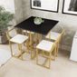 Conjunto De Mesa Preta 4 Cadeiras Pequena Estofado industrial Dourado O Conjunto Industrial Premium Faz Parte Da Nossa Coleção De Móveis Industriais, Onde o Design É Minimalista E Geométrico, Além De agregar Na Decoração E Otimizar O Espaço Do Seu Ambiente é Muito Confortável Pois Possui Encosto Com Uma Leve Inclinação. Este Conjunto É Ideal Para Apartamentos, cozinhas, Área De Lazer, Área Gourmet, bares E Restaurantes. (facilmente Adaptável A Qualquer Espaço, Pois As Cadeiras Se Encaixam Na Mesa). O Seu Material É De Aço Com Pintura Em Epóxi Eletrostática Tornando-a Mais Resistente Contra O Clima E Desgastes Naturais. o Assento é De espuma Revestido Com Tecido Sintético Garantindo Alta Resistência E Um Produto De Qualidade E Conforto Excepcional. Descrição Do Produto: Mesa: Cor Do Tampo: Preto Material Do Tampo: Madeira Largura: 70cm Comprimento: 70cm Altura: 75cm Estrutura: Aço Carbono Cor: Dourado Semi Brilho Pés com Nivelador De Regulagem E Emborrachados Cadeira: Largura: 34cm Comprimento: 32cm Altura Total: 65cm Altura Do Encosto: 18cm Assento: Espuma D28 Revestido Com Tecido Sintético Conteúdo Da Embalagem: - 1 mesa - 4 Cadeiras Importante: verificar A Integridade Do Produto No Ato Da Entrega, Se A Embalagem Não Estiver Em Boas Condições, Peça Para Verificar O Produto E Caso O Produto Esteja Danificado Recuse A Entrega Para Que A Troca Seja Possível.