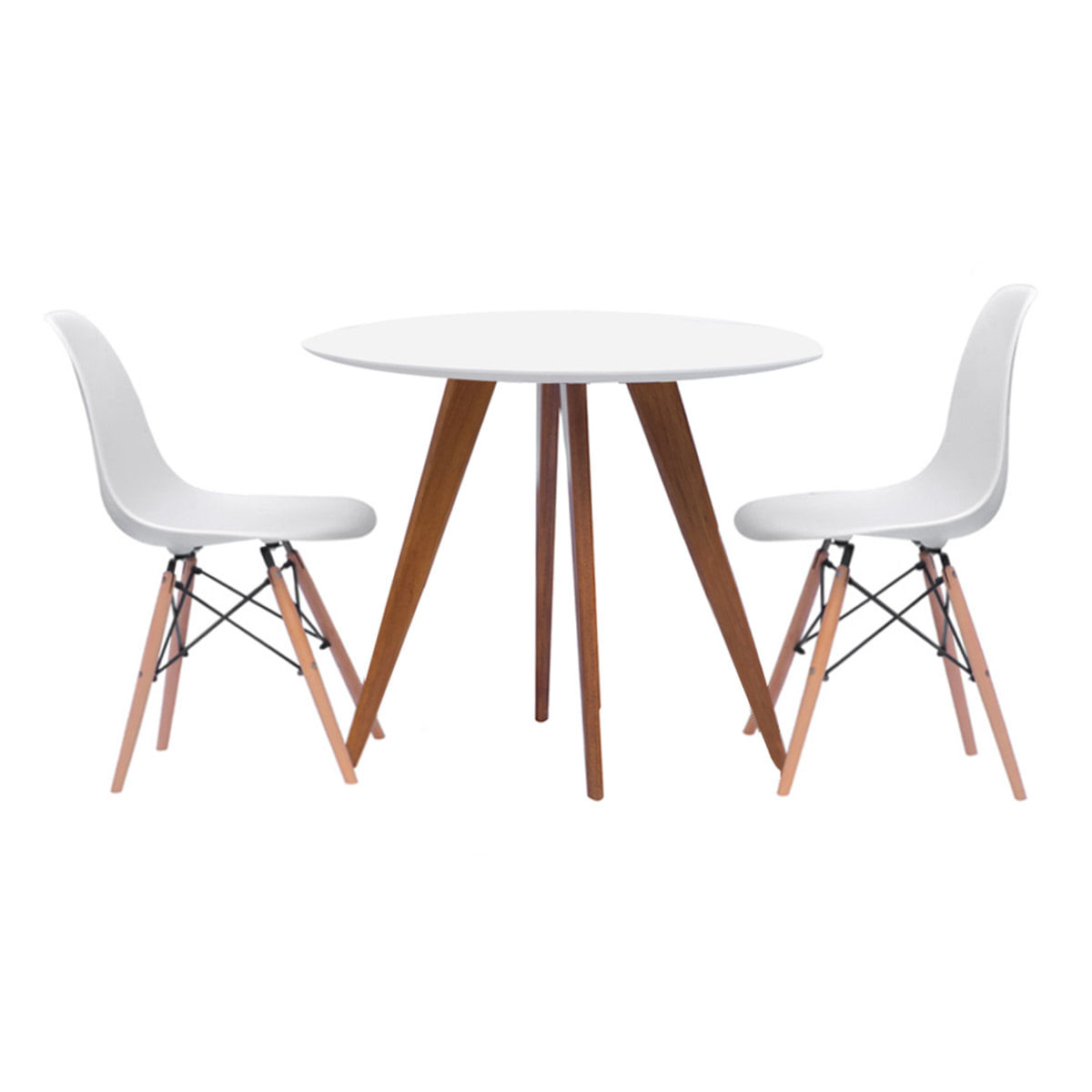 Juntamos para você os queridinhos do nosso site! A Mesa Square de 88cm de diâmetro em composição com 2 Cadeiras Eiffel, que trazem um visual incrível, moderno e exclusivo para o seu ambiente...A Mesa Square Branca é o produto ideal para compor uma decoração que não dispensa a elegância. Sofisticada, possui pés em madeira tauari e um tampo em MDF e MPD e acabamento branco fosco. Sem descuidar da qualidade, ela foi projetada de forma a proporcionar durabilidade e resistência...A Cadeira Eiffel Branca é um produto único que alinha design e sofisticação. Ela se adapta em ambientes modernos com uma decoração arrojada e inovadora, podendo ser utilizada na sala de estar ou em ambientes externos. Com pés de madeira, é uma ótima opção para a decoração da sua casa...Materiais:.¿ Pés de Madeira Tauari: É ecologicamente correta e moderadamente macia ao corte, apresentando um bom acabamento. O Tauari é obtido de florestas plantadas, ou seja, de árvores que foram feitas já com a finalidade de serem extraídas, e novas árvores são plantadas .¿ MDF: Painel de fibras de madeira de composição homogênea que garante resistência e um excelente acabamento além de não ser afetado pela variação de temperatura..¿ MPD: produzido em três camadas: uma grossa no miolo e duas finas nas superfícies. Essa composição heterogênea garante ao produto grande resistência estrutural, conferindo maior resistência ao empenamento, além de torná-lo um material mais leve..¿ Polipropileno: Confere alta durabilidade e resistência a cadeira Eiffel, resistente a detergentes e agentes de limpeza, resistente ao suor, mofo e intempéries, extremamente leve..Características Mesa Square:.¿Diâmetro de 88cm,.¿Moderna,.¿Versátil, combina com diversos ambientes,.¿Design único,.¿Pés em madeira maciça (Tauari), .¿Tampo em MDF,.¿Pintura em laca acetinada - Branco fosco,.¿Suporta até 35KG,.¿Medidas: Altura: 76cm | Largura - 88cm | Comprimento - 88cm .¿Peso - 21kg,.¿Comporta até 4 lugares...Características Cadeira Eiffel:.¿Moderna.¿Versátil, combina com diversos ambientes.¿Design único.¿Encosto arredondado.¿Assento em polipropileno.¿Cor: Branco.¿Encosto arredondado.¿Pés em madeira.¿Suporta 120kg.¿Medidas: Altura - 83cm / Largura - 46,50cm / Comprimento - 52cm