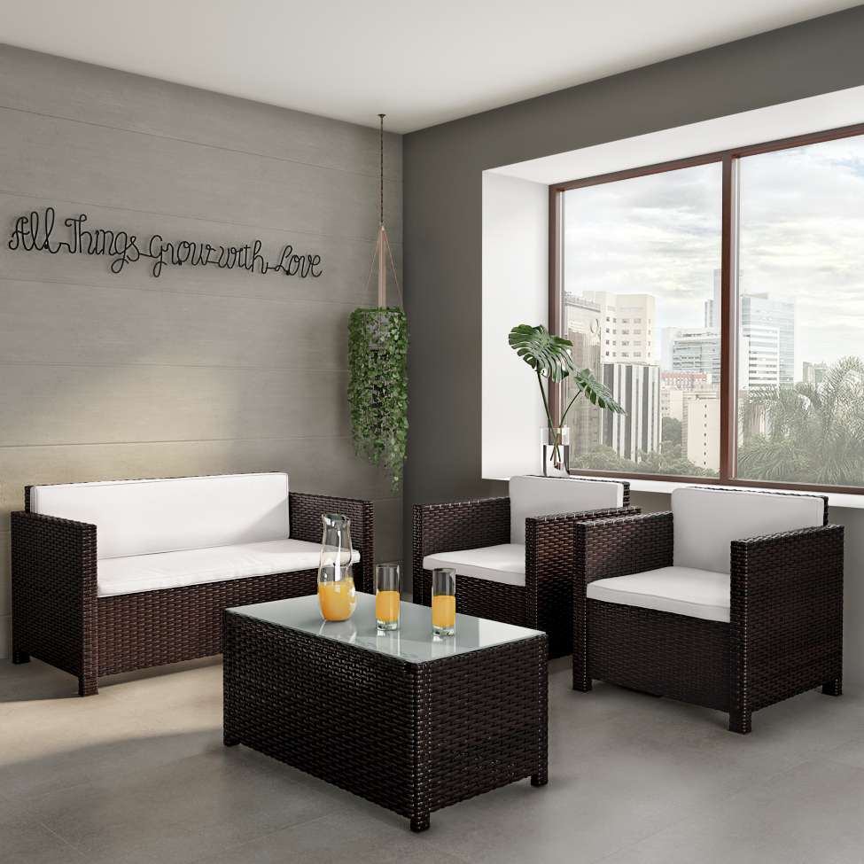 Que tal o Conjunto para Área Externa Ariella?O Conjunto Ariella é perfeito para reunir a família e os amigos nos dias agradáveis de verão para curtir bons momentos. Completo, ele conta com três poltronas e uma mesa de centro, que acomodam muito bem a todos e ainda oferece espaço para apoiar as bebidas e petiscos da vez. Mas, como nem sempre os amigos podem vir, você também pode utilizá-lo para relaxar e curtir seus bons livros nos finais de semana. Daí, além de elevar a receptividade nas suas confraternizações, ele também aumenta seu bem-estar no dia a dia :)