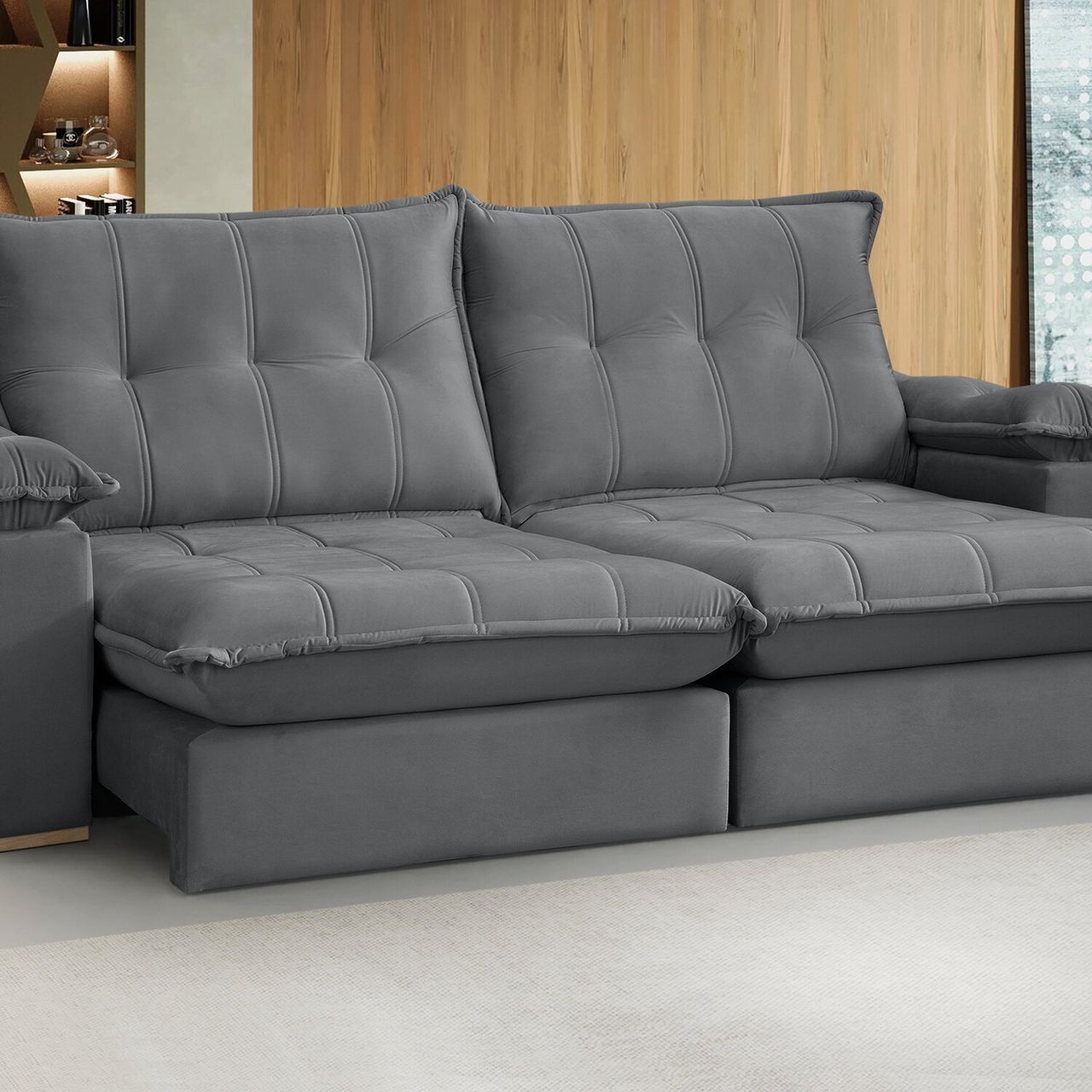 Estilo: Moderno | Modular: Sim | Peso (kg): 92 | Garantia: 03 Meses | Altura (cm): 105 | Bipartida: Sim | Largura (cm): 290 | Possui Baú: Sim | Possui Pés: Sim | Possui Mola: Sim | Pet Friendly: Sim | Tipo De Mola: Molas Ensacadas (pocket) | Tipo De Sofá: Conjuntos De Sofás | Altura Dos Pés: 2.5 | Modelo Do Sofá: Retrátil E Reclinável | Possui Rodízio: Sim | Suporta Até (kg): 120 | Altura Do Braço: 25 | Estilo De Braço: Braços Pillow Top | Profundidade (cm): 120 | Tipo De Encosto: Regulável | Largura Do Braço: 25 | Material Dos Pés: Madeira | Altura Do Encosto: 58 | Origem Do Produto: Nacional | Rodízio Com Trava: Não | Acompanha Almofada: Sim | Ambiente Principal: Sala De Estar | Firmeza Do Assento: Macio | Almofada Do Assento: Fixa | Almofada Do Encosto: Fixa | Quantidade De Itens: 2 | Tecido Predominante: Veludo | Densidade Do Assento: D-28 | Densidade Do Encosto: D-24 | Enchimento Do Assento: Espuma | Enchimento Do Encosto: Fibra Siliconada | Material Da Estrutura: Madeira Eucalipto | Peso Suportado Por M²: 120 | Quantidade De Lugares: 4 | Revestimento Do Braço: Tecido | Possui Apoio Para Braços: Sim | Serviço Impermeabilização: 102610509 | Acompanha Almofadas Extras: Não | Possui Percintas Elásticas: Sim | Altura Do Assento Até O Chão: 47 | Material Da Corrediça Do Sofá: Aço/metal | Profundidade Quando Estendido: 180 | Quantidade De Molas Por Assento: 148 | Quantidade De Estágios Do Encosto: 7 | Fabricante: Fatto Estofados | Marca: Fatto Estofados | Cor Do Produto: Cinza | Itens Inclusos: Nao Possui | Cor Predominante: Cinza | Linha Ou Coleção: Estofado