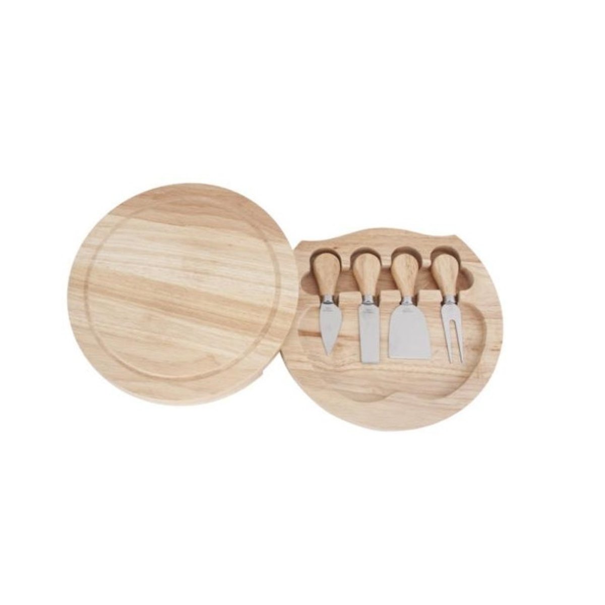 Tábua e 4 utensílios para queijos e frios..Tábua com 25 cm de diâmetro. Altura 3,8 cm..Cortador queijo duro, cortador queijo macio, garfo e faca inox...Espátula: 12 cm.Garfo: 12,5 cm.Fatiador: 12,5 cm.Faca: 12 cm