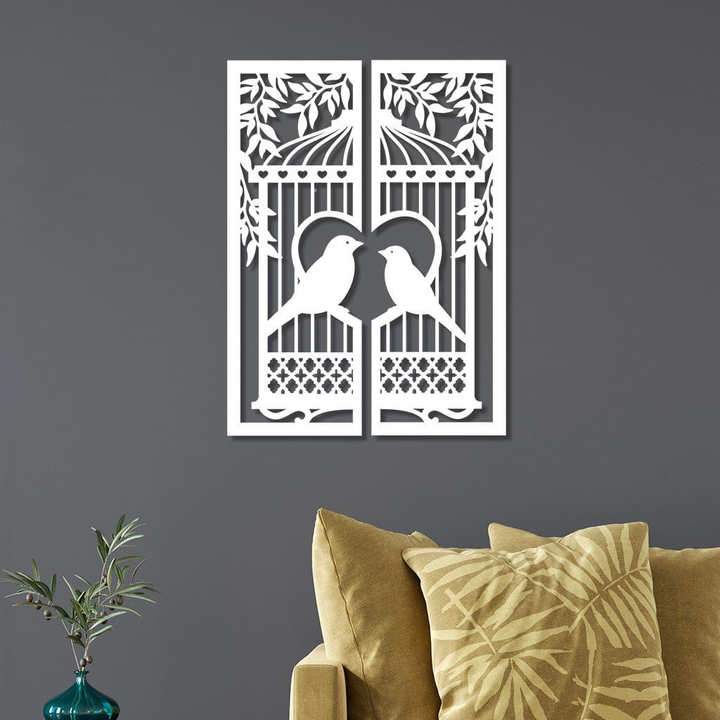 Conjunto 2 Quadros Vazados Em Mdf Gaiola Passarinho Branco - 22cm X 60cm -