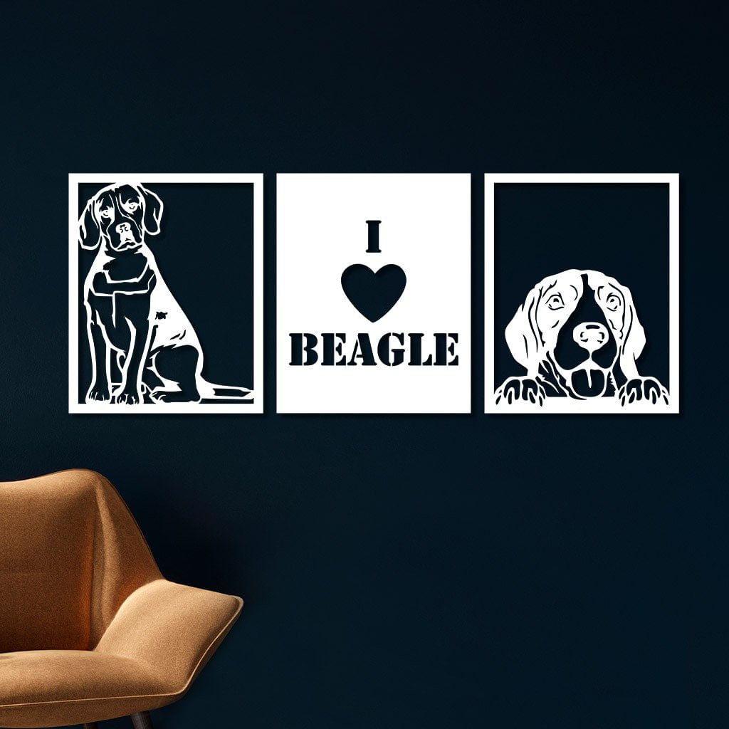 Conjunto 3 Quadros Vazados Em Mdf Beagle 2 Com Moldura Branco - 30cm X 37cm -