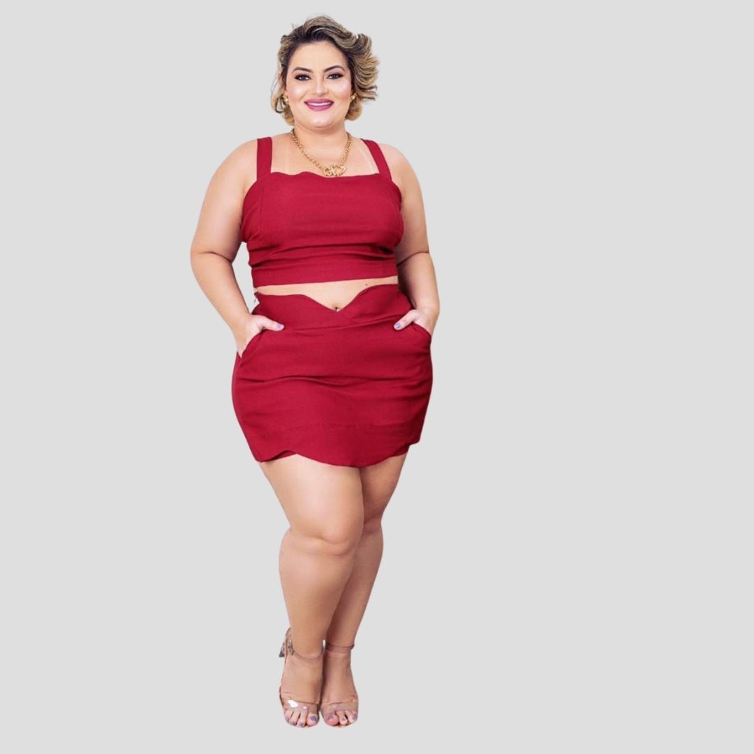 Conjunto Plus Size composto de cropped com ziper nas costas, shorts saia com ziper lateral, modelagem confortavel e bonita. Tecido de qualidade com muito elastano. Look moderno e confortável, com boa sustentação na regição do busto e forro, alcas lagas para utilizar com sutiã caso queira. Este produto é feito por uma microempreendedora devidamente legalizada, que emprega pessoas e estimula a economia local.