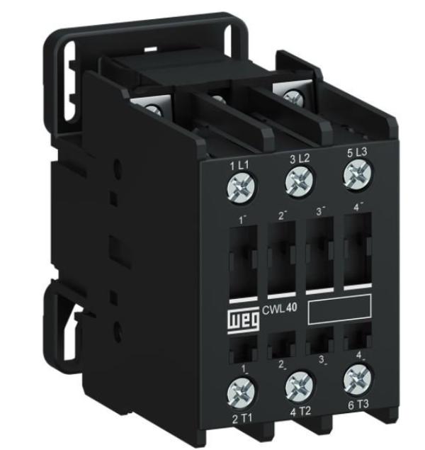 Contator CWL - WEG 40A - Contator CWL - WEG.. CONTATOR..MODELO: CWL..CARACTERÍSTICAS..Desenvolvidos para atender com eficiência e qualidade as funções essenciais para partida e proteção de motores em aplicações específicas, os Contatores CWL possuem a performance na medida exata, com desempenho otimizado e excelente custo-benefício para o seu dia a dia...Aplicações..Construção civil,.Indústria de alimentos,.Indústria têxtil,.Agronegócio.....ATENÇÃO!!.-> Ao selecionar a amperagem desejada, fique atento as informações abaixo:..Corrente nominal In - AC-3 (Ue ≤ 440 V) = 9 A 12 A 18 A 25 A 32 A 40 A 45 A.Corrente nominal In - AC-4 = 3,5 A 4,5 A 8 A 9 A 15,6 A 18,5 A 24 A.Corrente nominal de emprego Ie - AC-1 (q = 55 ºC) = 25 A 25 A 25 A 32 A 45 A 50 A 50 A..-> Vida mecânica (CA) 8 milhões.** exceto CWL45, este possui 5 milhões..-> Tipo de terminal: Parafuso..-> Contato principal: 3 NA..Características Gerais do Produto:.. Proteção: Grau de proteção (IEC 60529) - Bobina e contatos auxiliares IP20. Tensão: Tensão de comando 220V 50/60Hz. Isolação: Tensão nominal de isolação Ui (grau de poluição 3) - IEC 60974-4-1 690 V. Tensão de Emprego: Tensão nominal de emprego Ue - IEC 60947-4-1 690 V. Dimensões (mm) / Peso (g): 35A = 80 (A) x 45 (L) x 85 (C) / Aproximadamente 300 kg --- 40/45A = 35A = 85 (A) x 55 (L) x 100 (C) / Aproximadamente 600 kg. Máxima frequência de manobra (man./h): Limite mínimo de frequência 25 Hz // Limite máximo de frequência 400 Hz..Acompanha o produto:.. 1 Contator CWL. 1 Manual na caixa. 1 Bloco de contato auxiliar 1NA. 1 Bloco de contato auxiliar 1NF..Garantia:.. 3 meses com a loja