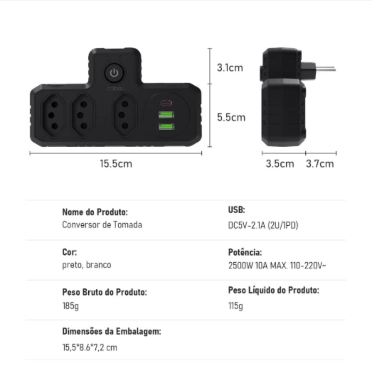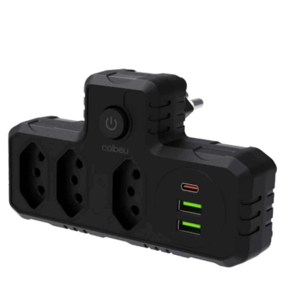 O Conversor de Tomada Coibeu foi desenvolvido para entregar praticidade, segurança e eficiência no uso diário de aparelhos eletrônicos. Com design compacto e funcional, ele amplia a capacidade da tomada sem obstruir interruptores ou entradas adjacentes, sendo ideal para residências, escritórios e viagens. Fabricado com materiais retardadores de chamas e seguindo o padrão brasileiro, oferece proteção e durabilidade superiores. Conta com três tomadas de energia, duas portas USB e uma porta Type-C, permitindo carregar vários dispositivos simultaneamente.