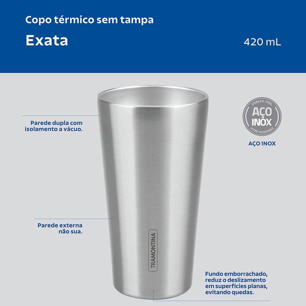 Copo Térmico Tramontina Exata Parede Dupla Em Aço Inox Sem Tampa 420 Ml 61646430marca: Tramontinamodelo: Tramontina Exata Em Aço Inox Sem Tampa 420 Ml 61646/430descrição Do Copo Térmico Tramontina Exata- Suas Festas E Encontro Com Os Amigos Merecem Bebidas E Drinks Na Temperatura Ideal Por Mais Tempo!- E Para Isso, O Copo Térmico Tramontina Exata Em Aço Inox Com Parede Dupla Sem Tampa 420 Ml É Essencial.- Produzido Em Aço Inox Com Parede Dupla E Isolamento A Vácuo.- O Copo É Livre De Bpa, Fácil De Limpar, Não Mancha E Não Retém Odores, O Que Permite Que Seja Utilizado Com Os Drinks Mais Variados.- Escolha Tramontina E Torne Seus Momentos Inesquecíveis!informções Gerais Do Copo Térmico Sem Tampa- Os Copos Térmicos Inox Tramontina São Feitos Em Parede Dupla De Aço Inox Com Isolamento A Vácuo Para Manter As Bebidas Frias Ou Quentes Por Mais Tempo.- Aproveite Seu Chá Ou Seu Café Quente, Drink Favorito Ou Bebida Gelada Até O Fim.- Livre De Bpa Fácil De Lavar, Não Mancha, Não Quebra E Não Retém Odores.- A Parede Dupla, Além De Conservar A Temperatura Evita Que A Parede Externa Aqueça Com Bebidas Quentes Ou Sue Com Bebidas Geladas.- Compatível Com A Maioria Dos Porta Copos. Uso Recomendado Tanto Para Adultos Quanto Para Crianças Acima De 3 Anos.- Produto Reutilizável.- Fundo Emborrachado, Reduz O Deslizamento Em Superfícies Planas, Evitando Quedas.- Pode Ser Lavado Diariamente Na Máquina De Lavar Louças.orientações De Uso - Não Utilize Produtos Abrasivos, Pois Eles Podem Riscar O Aço Inoxidável.- Lave Com Detergente Neutro E Esponja Macia, Também Pode Ser Lavado Diariamente Na Máquina De Lavar Louças.- Não Guarde O Produto Molhado. Não Utilize Ebulidor Elétrico Para Aquecimento.- Não Encha Demasiado Com Líquidos Quentes.- Os Líquidos Quentes Podem Causar Queimaduras.- Evite Utilizar Leite E Derivados, Pois São Produtos Perecíveis E Estes Não Devem Permanecer Por Longos Períodos Fora De Refrigeração.- Para Remover Odores Desagradáveis Ou Manchas Persistentes, Deixe O Copo De Molho Em Uma Solução Com Água Quente E Bicarbonato De Sódio.- Dicas: Recomendamos Aquecer Ou Refrigerar Antecipadamente O Copo Antes De Usar, Para Manter O Líquido Por Mais Tempo Aquecido/frio.garantia- 90 Dias De Garantia Legal Para Vícios Ou Defeitos De Fabricação.peso- 0.2 Kgdimensões- Dimensões Do Produto (compr. X Larg. X Alt.): 106x101x193 Mm- Dimensões Da Embalagem (compr. X Larg. X Alt.): 112x112x202 Mm.
