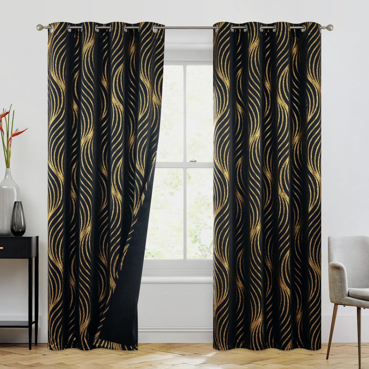 - Brilho Dourado Metálico: A Clássica Estampa De Pontos De Onda Dourada Nas Cortinas Adiciona Um Toque Moderno E Bonito. Seja No Quarto Ou Na Sala De Estar, Estas Cortinas Complementam Perfeitamente Sua Decoração