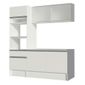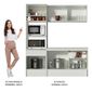 O kit é composto por um balcão com tampo, uma torre-quente com espaço para micro-ondas e forno elétrico e um lindo armário aéreo com portas de correr de vidro. Um charme só! São várias portas, nichos, prateleiras e uma gaveta. Ou seja, não vai faltar espaço para você organizar todos os utensílios da cozinha. O tampo do balcão também pode ser removido para a instalação de pia de inox ou pedra, no tamanho de 120 x 52 cm. Para completar, esta cozinha conta com rodapé fixo na parte inferior, conferindo mais segurança e estabilidade. O acabamento interno e externo é branco, feito com a pintura poliéster de sete camadas exclusiva da Madesa. Um método ecológico e que protege o móvel dos efeitos da água e do calor.